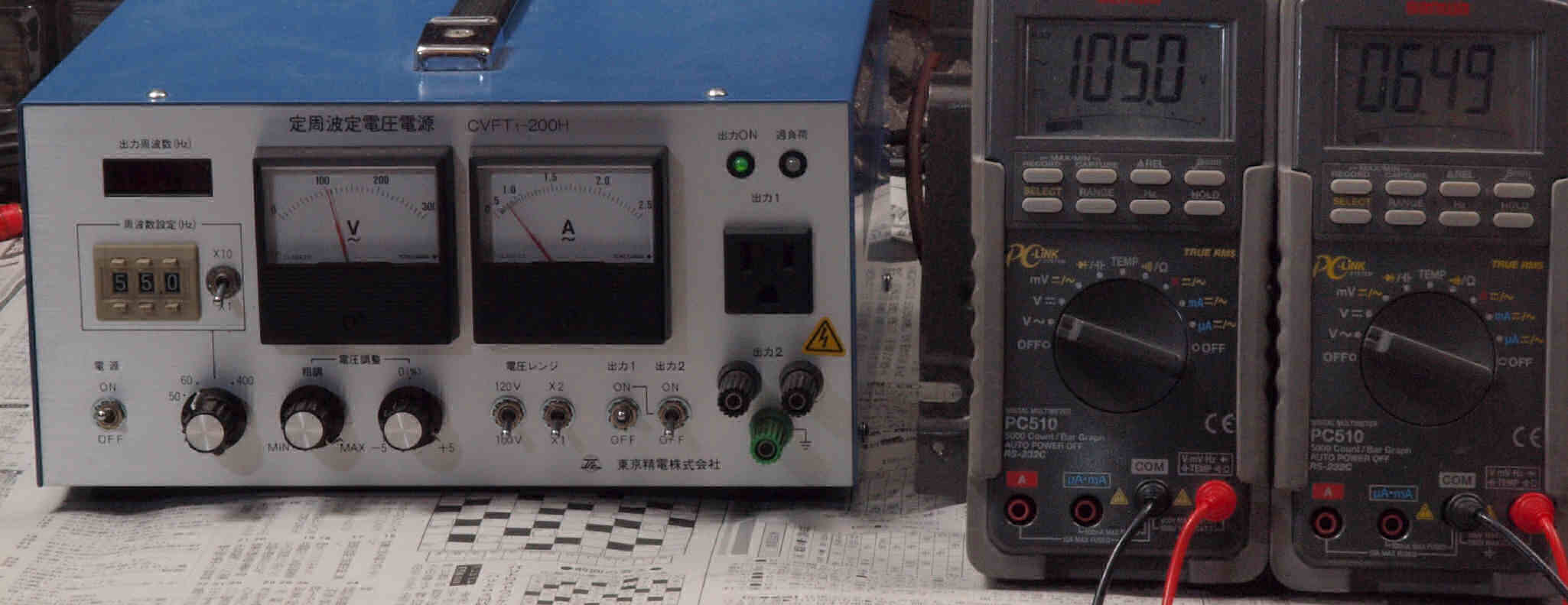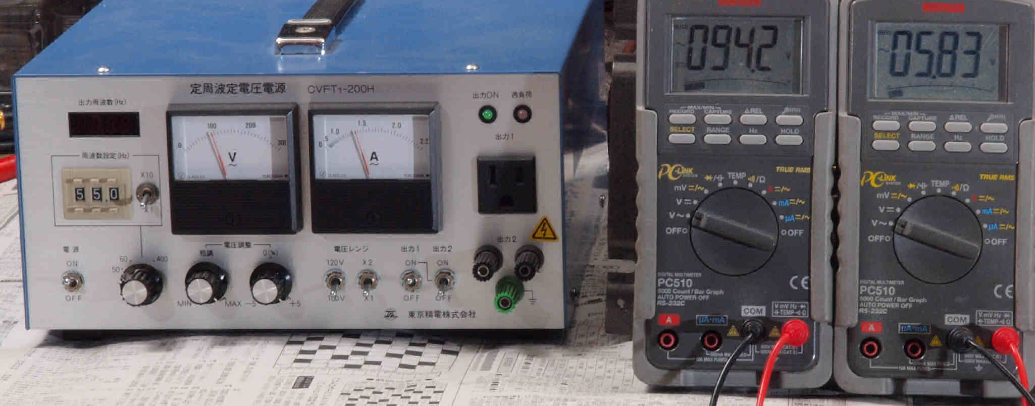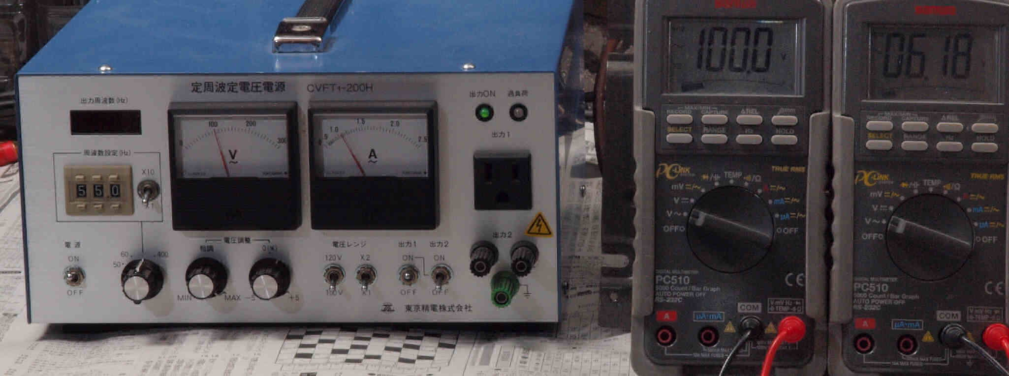 | P. 電源トランス点検。画像をクリックすると、大きく(横幅2050ドット)表示されます。 可変周波数・電圧電源を使用して、無負荷損を計測する。 真空管は全て抜いたので、トランスの負荷は無。 左マルチメーター=電源電圧、右マルチメーター=ヒーター電圧。 |