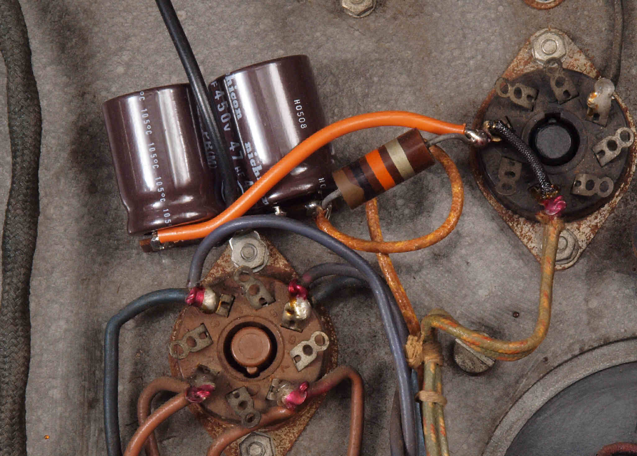 | A17. 点検中 シャシ内をる。 高圧純正のマロイ電解コンデンサーからニチコン電解コンデンサーに交換。 |