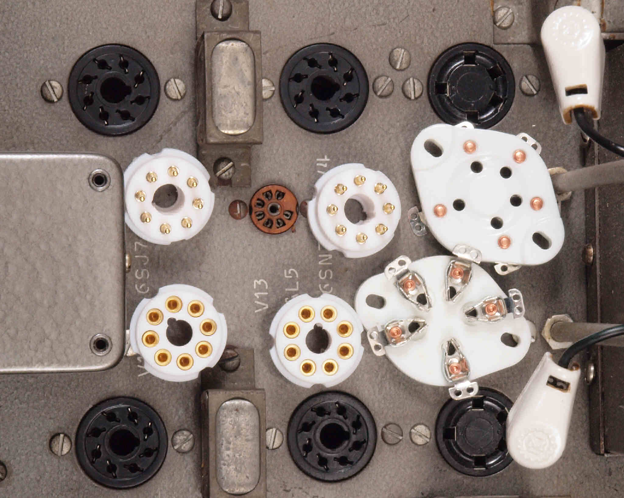 | A25. 点検中 真空管を抜き、後から見る。 真空管ソケット比較。テフロン絶縁製やタイト製と交換可能。 |
