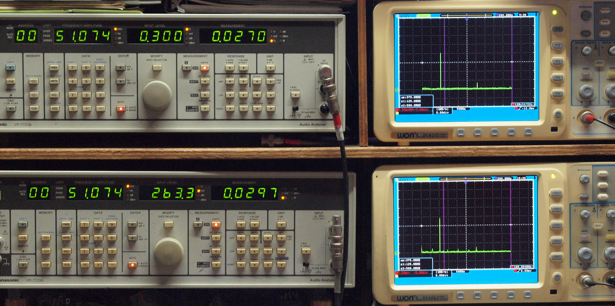 よって、ダイアル設定出力レベルより低くなります。測定機器の仕様や整備の様子はこちら、「VP−7723B」「VP−7201A」。 FFT画面の見方はこちら。