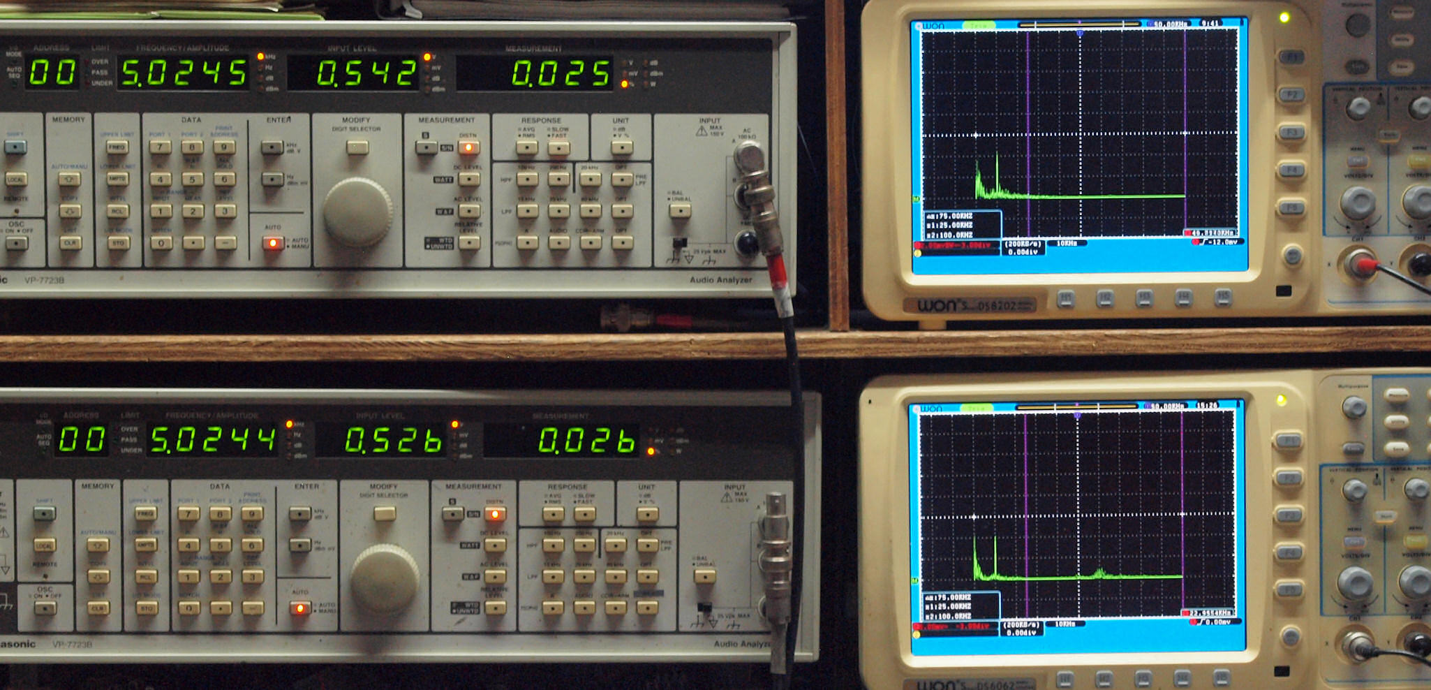 上段右端 VP−7723Bの基本波除去出力を「owon SDS8202(200MHZ)」で「FFT分析」表示。