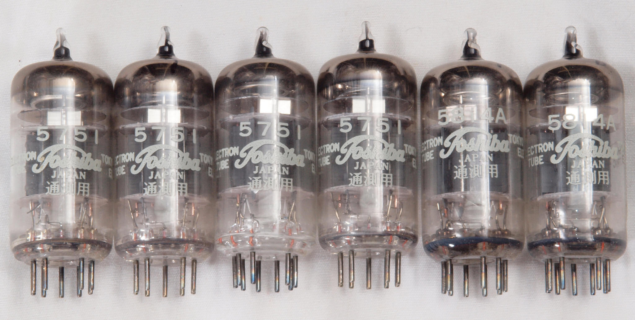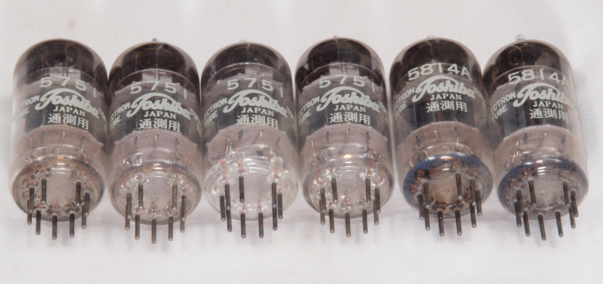 A62. 点検中 付属真空管。袴(ステム側)から見る。 5751&5814Aはヒーターが12V/175mA。12AX7&12AU7はヒーターが12V/150mA。このアンプは6本直列で72Vを供給する。