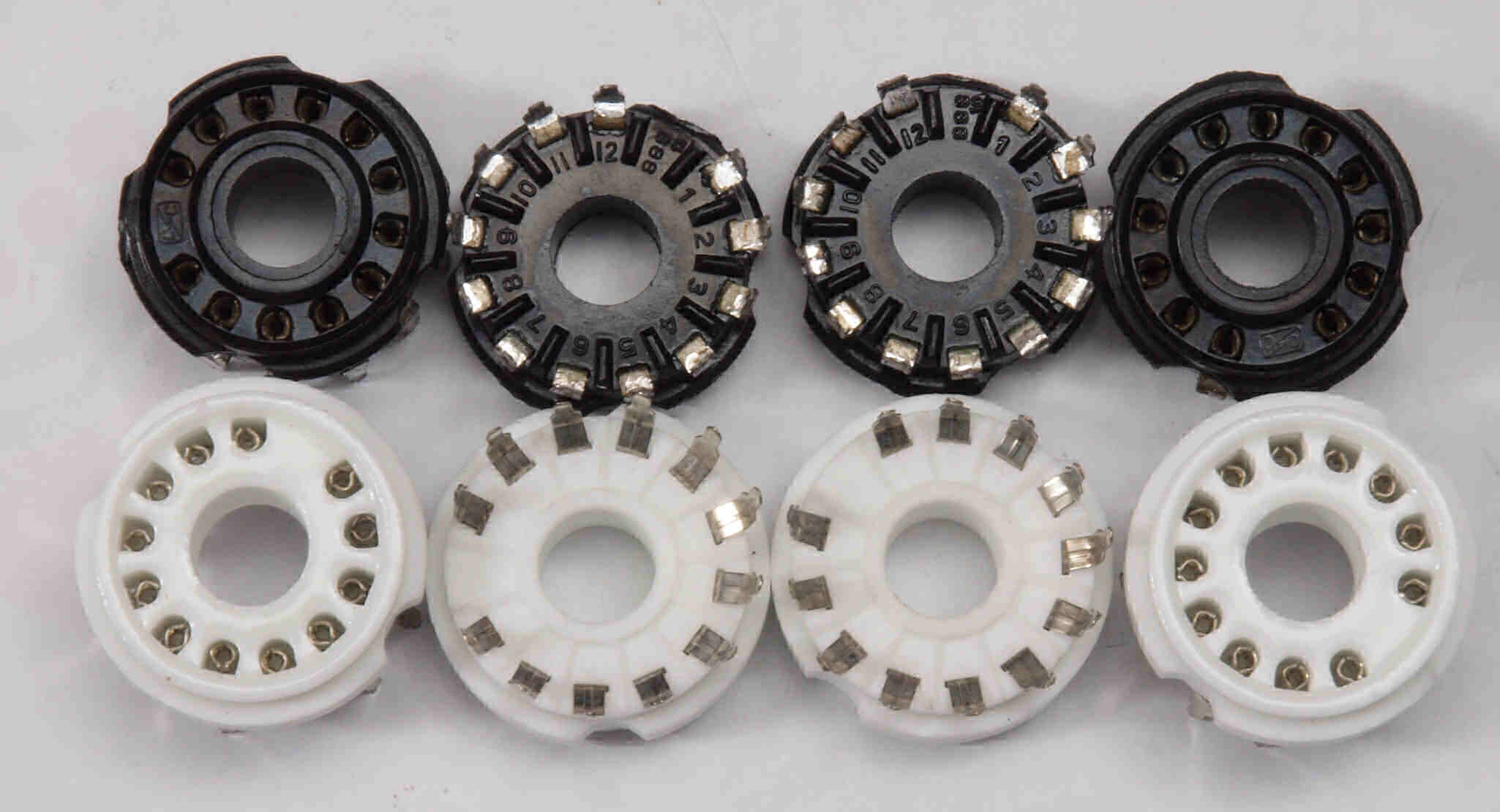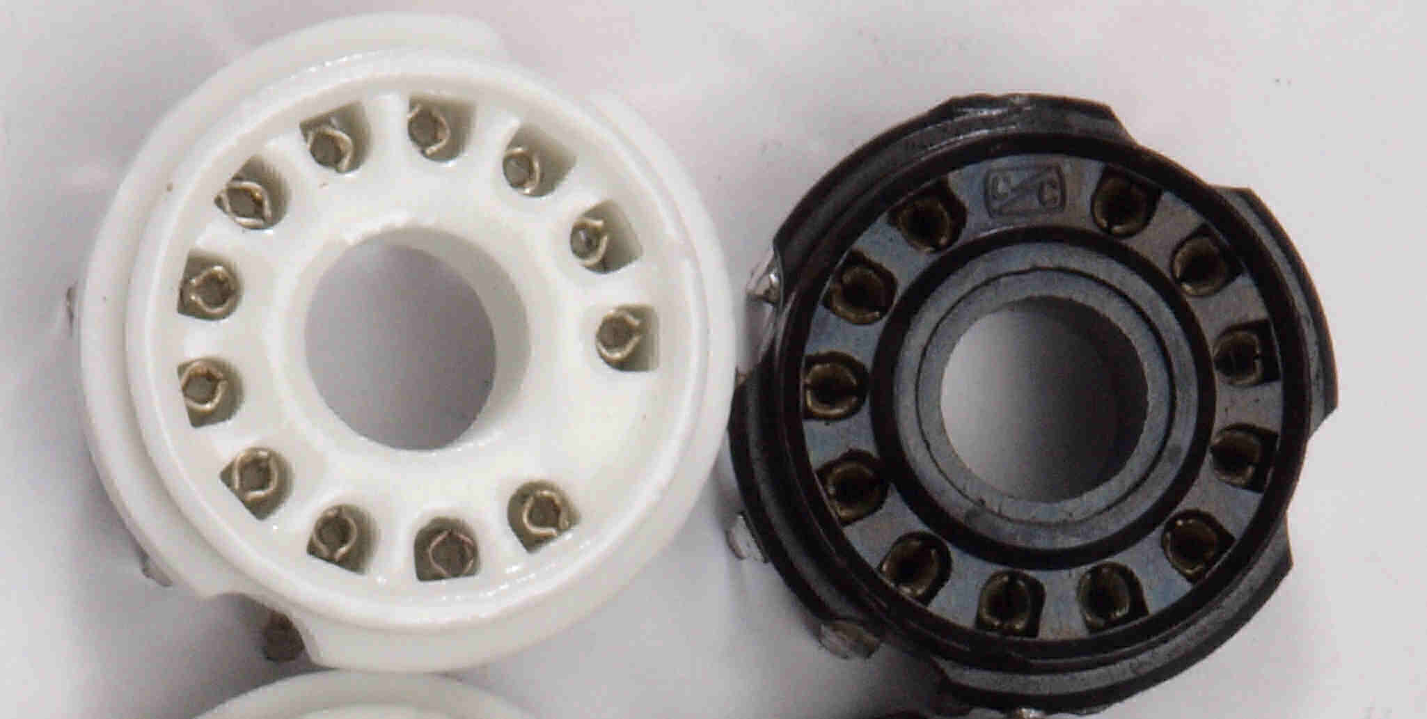 | C94.交換部品 6LF6の12ピン・コンパクトロンソケット。 上=付いていたモールド製、下=交換するステアタイト製。 | ||||||||||||||||||||||