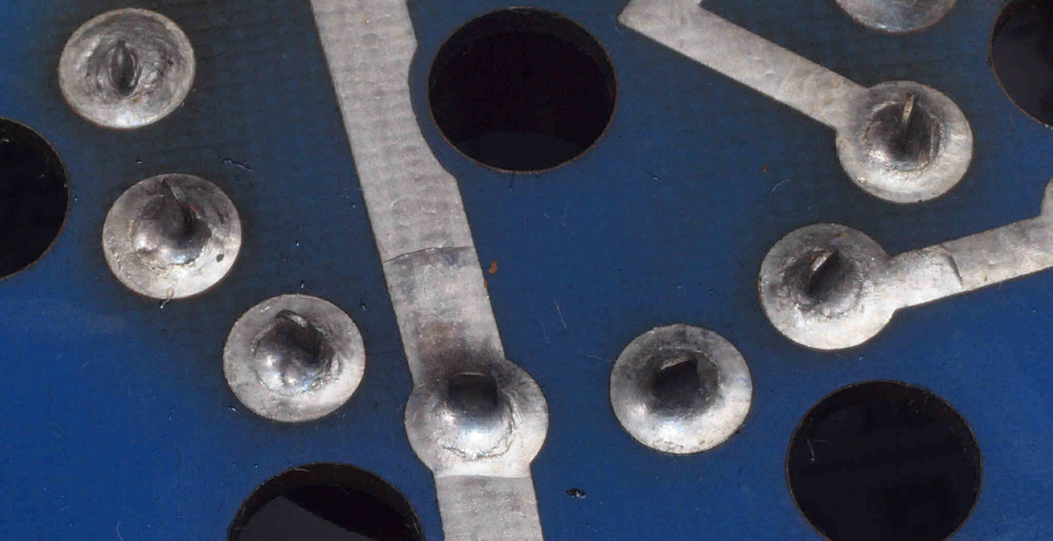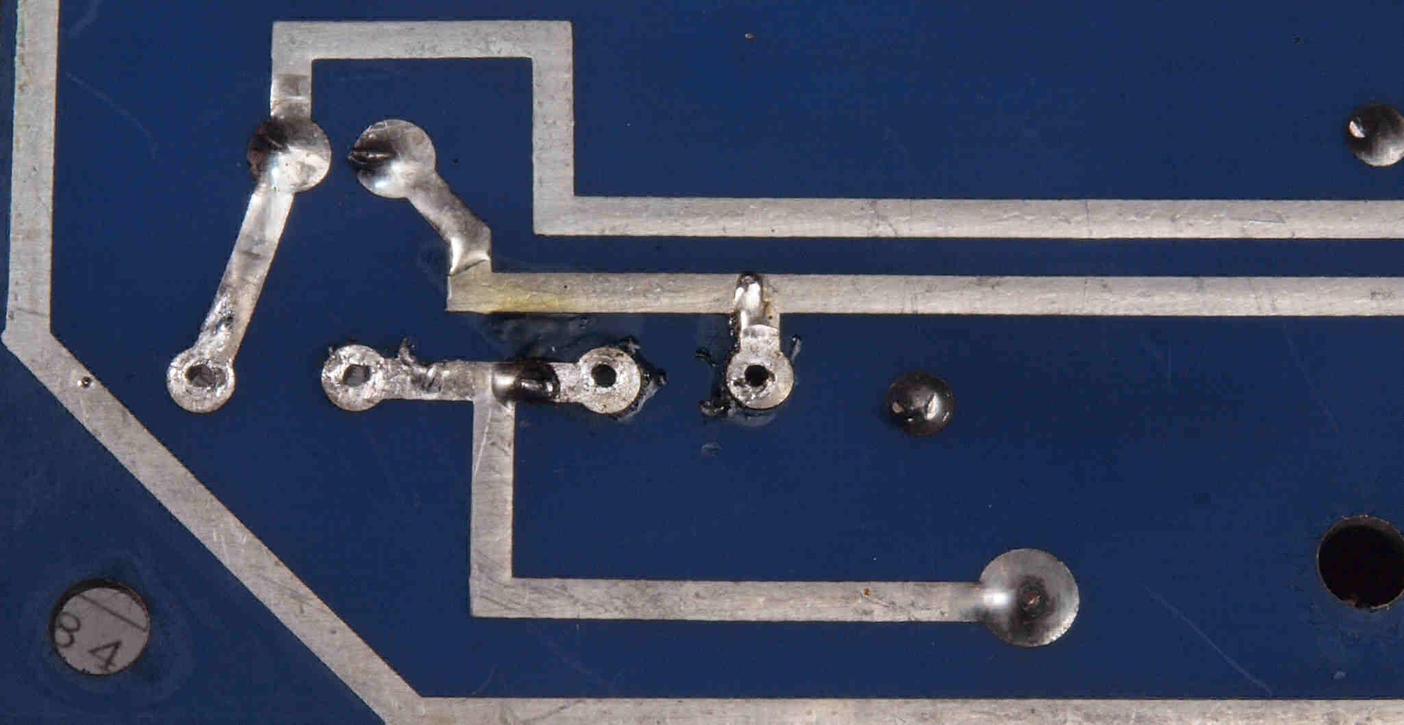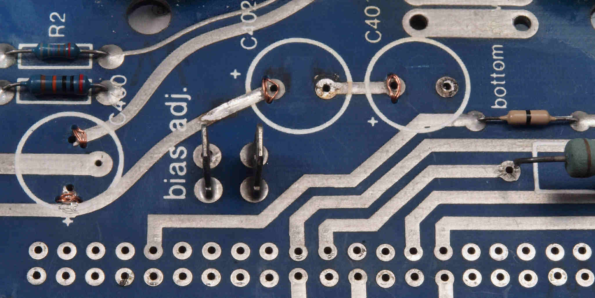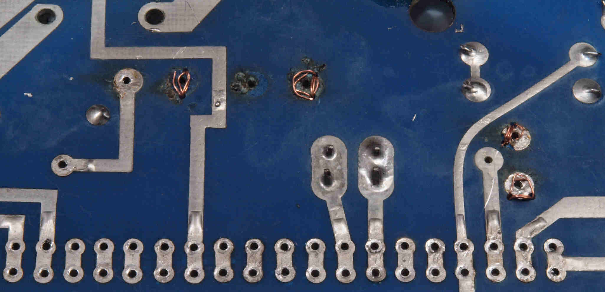 | C1I4. 完成 終段6LF6基板裏の銅箔はく離。 スルホール修復、更に半田付け。1ヶ所増えてます。 | ||||||||||||||||||||||
