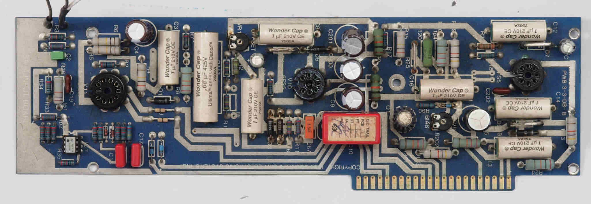 | C112. 修理中 終段6LF6基板。エッジコネクター端子取り付け部の接点復活材跡、1部緑青が発生している。 | ||||||||||||||||||||||
