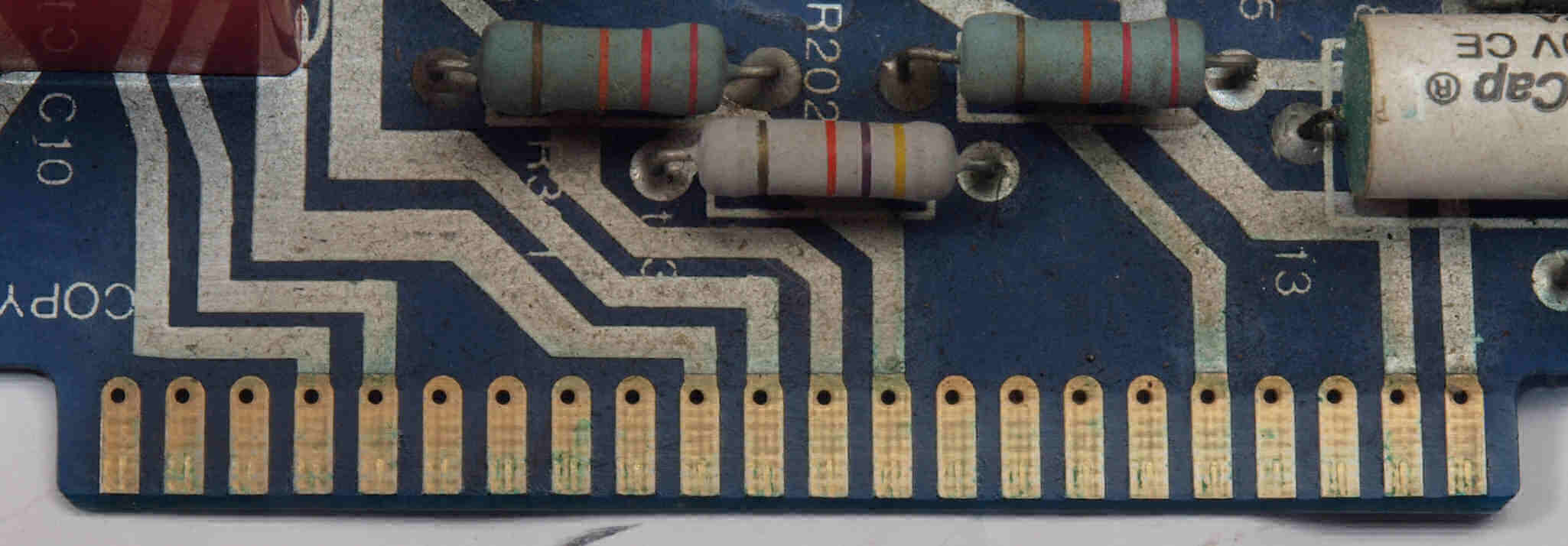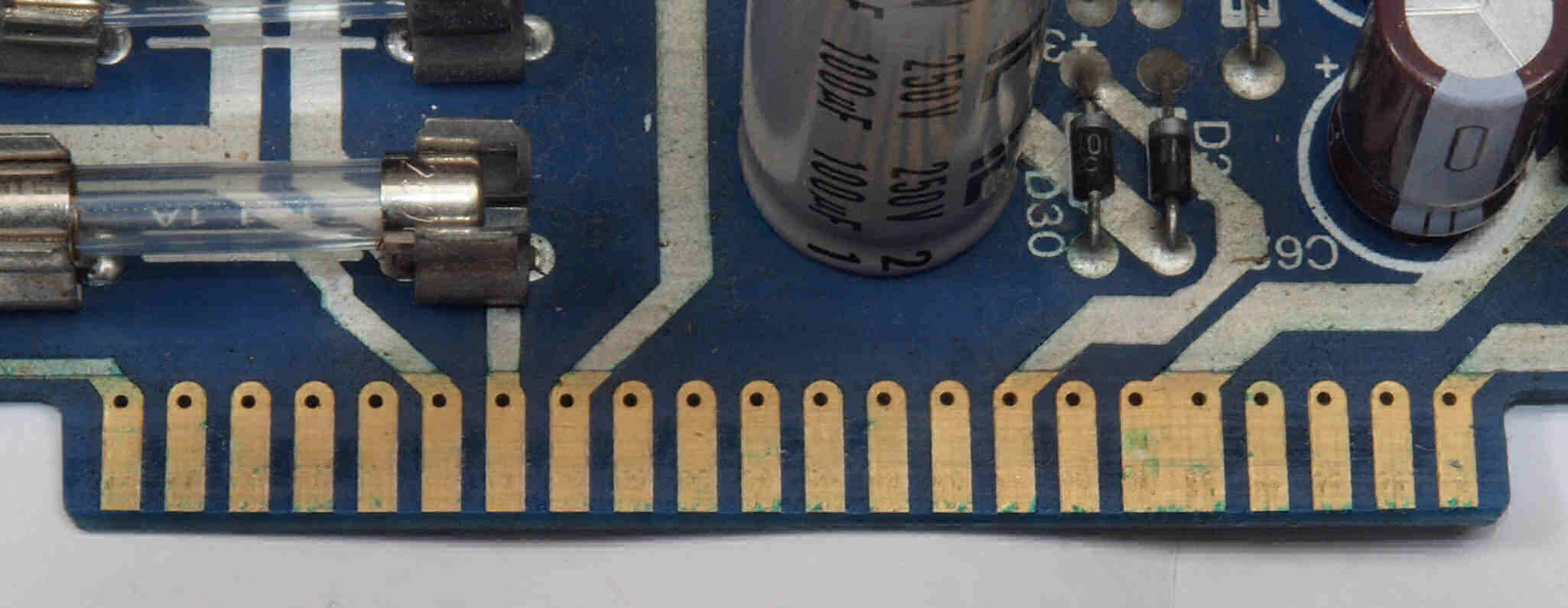 | C113. 修理中 終段6LF6基板。エッジコネクター端子取り付け部の接点復活材跡、1部緑青が発生している。 | ||||||||||||||||||||||