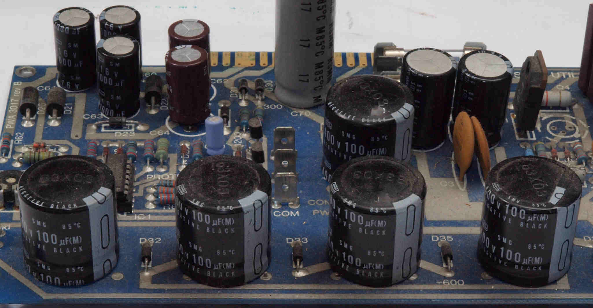 | C312. 修理前 電源基板。電解コンデンサーの頭のビニールが少し膨らんでいる。 | ||||||||||||||||||||||
