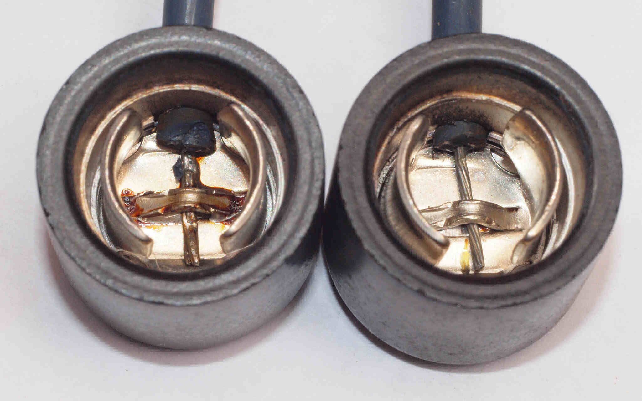| C96.交換部品 6LF6のプレート・キャップ。 左=付いていたモールド製、右=交換するステアタイト製。 | ||||||||||||||||||||||