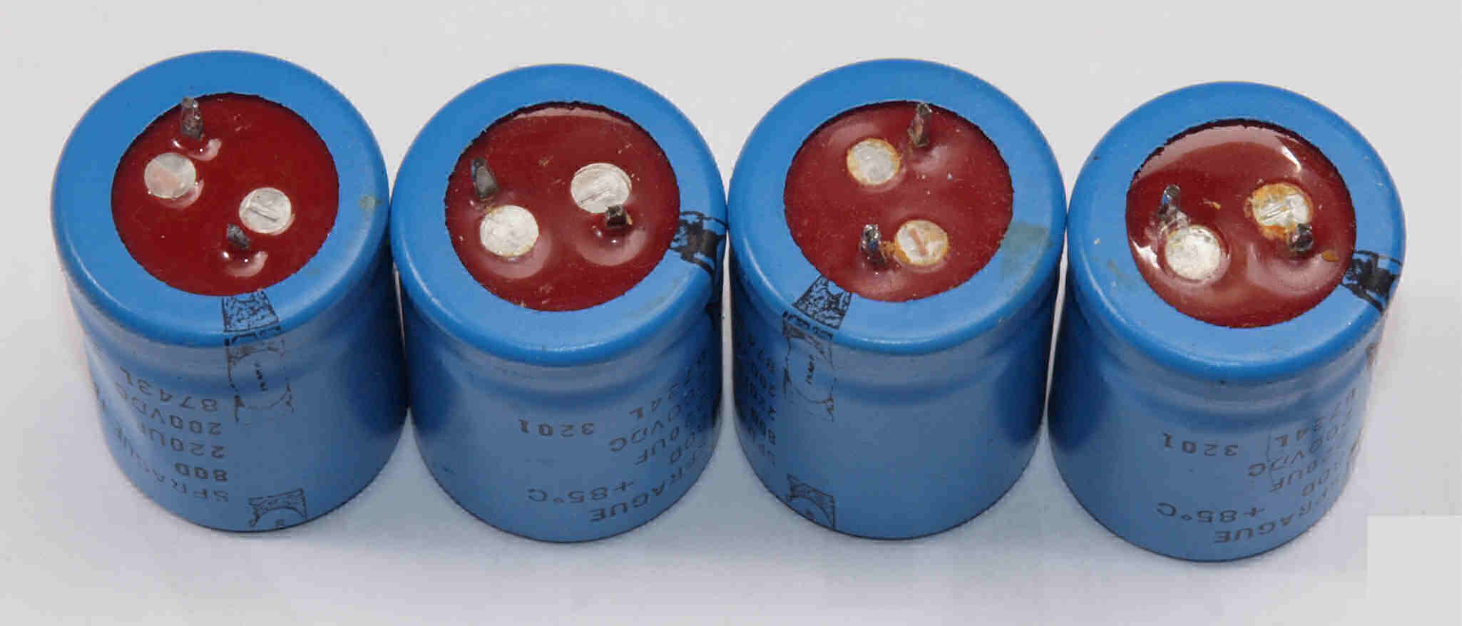 | C322. 修理中 電源基板裏。 交換した電解コンデンサーの交換の液漏れ跡。左の2個1台目の物と比較する。 | ||||||||||||||||||||||