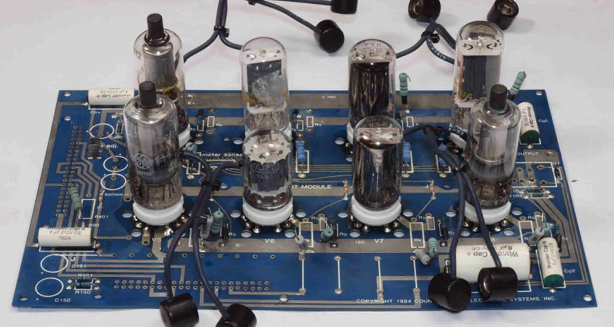 | C23. 修理中 入力・ドライブ基板。 洗浄後、真空管ソケット・部品を取付け中。 真空管ソケットの固定(半田付け)は、ジャンク真空管をしっかり挿入して行う。 |