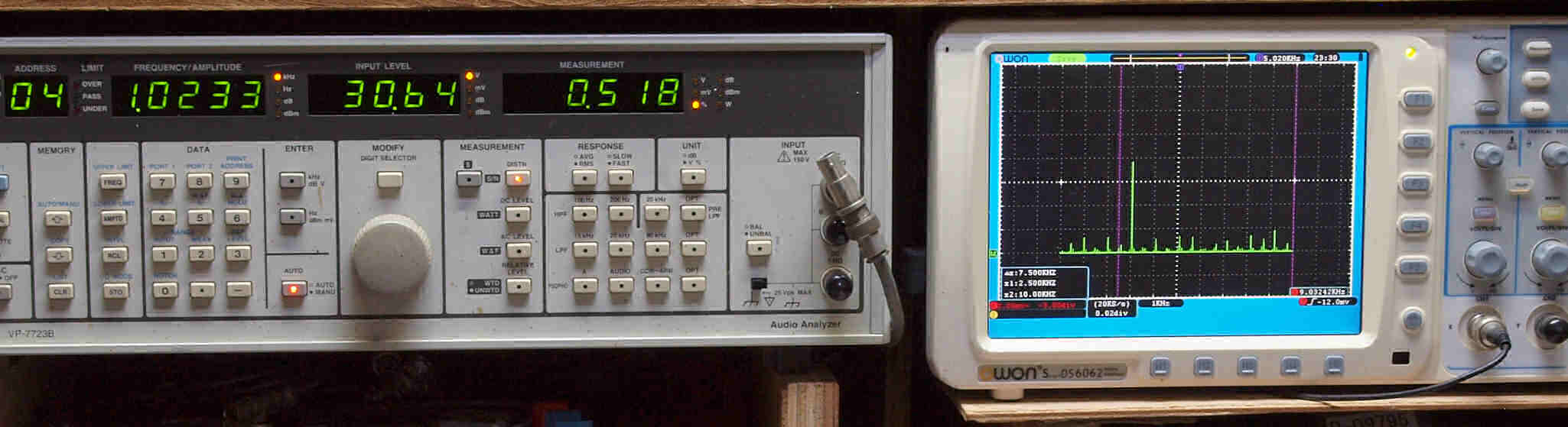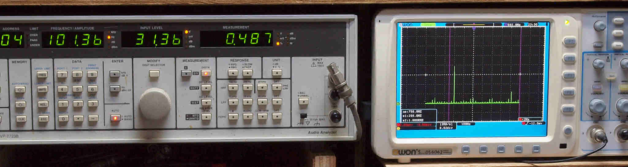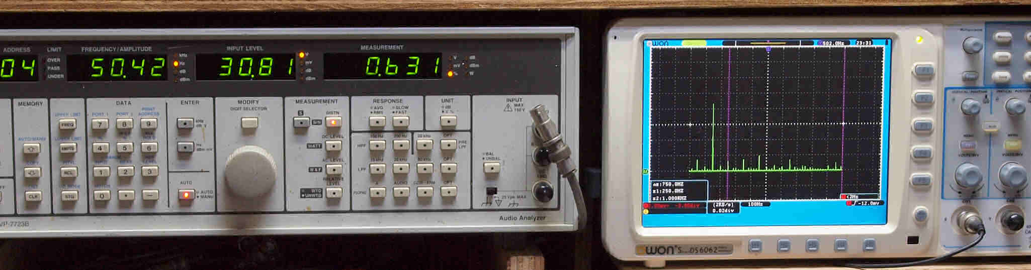 | E. 調整・測定。画像をクリックすると、大きく(横幅2050ドット)表示されます。 E0. 出力・歪み率測定・調整。 「見方」。 上段中 右側SP出力を「Audio Analyzer Panasonic VP−7723B」により測定。 表示LED、 左端=メモリーNo、 中左=周波数測定、 中右=出力電圧測定、 右端=歪み率測定。 上段右端 VP−7723Bの基本波除去出力を「owon SDS8202(200MHZ)」で「FFT分析」表示。 下段中 左側SP出力を「Audio Analyzer Panasonic VP−7723B」により測定。 表示LED、 左端=メモリーNo、 中左=周波数測定、 中右=出力電圧測定、 右端=歪み率測定。 下段右端 VP−7723Bの基本波除去出力を「owon SDS6062(200MHZ)」で「FFT分析」表示。 下段左端 オーディオ発振器 VP−7201A より50Hz〜100kHzの信号を出し(歪み率=約0.003%)、ATT+分配器を通し、AMPに入力。 よって、ダイアル設定出力レベルより低くなります。測定機器の仕様や整備の様子はこちら、「VP−7723B」「VP−7201A」。 FFT画面の見方はこちら。 測定条件。 使用終段「6LF6」は付いていたのを使用。 バイアス電流値。 1本目6LF6=100mA 2本目6LF6=100mA 3本目6LF6=80mA 4本目6LF6=80mA 5本目6LF6=75mA 6本目6LF6=80mA 7本目6LF6=100mA 8本目6LF6=70mA 飽和出力は200Wを越えます。 |