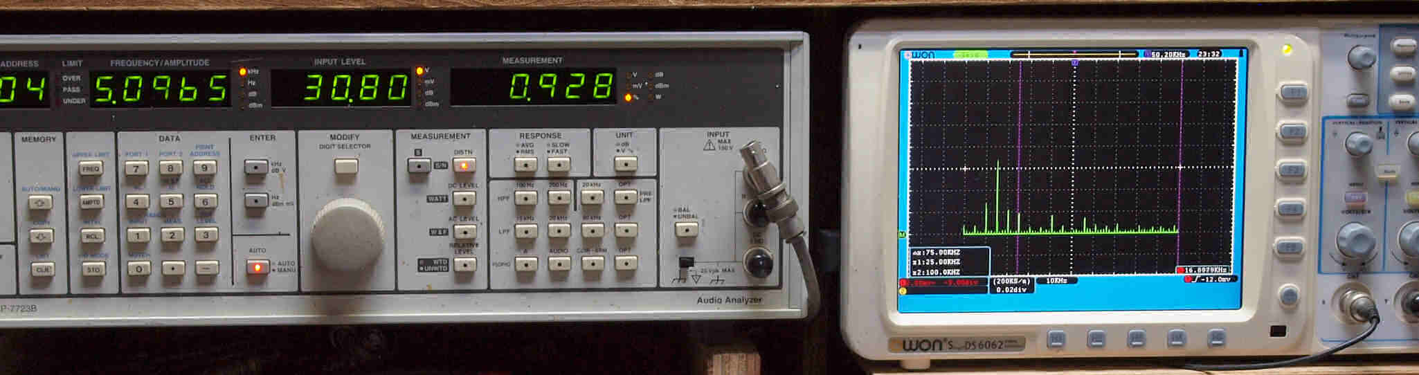 | E5. 5kHz入力、SP出力電圧30V=112.5W出力、 0.928%歪み。 「FFT分析」のオシロのカーソル周波数、左=25kHz、右=100kHz。 |