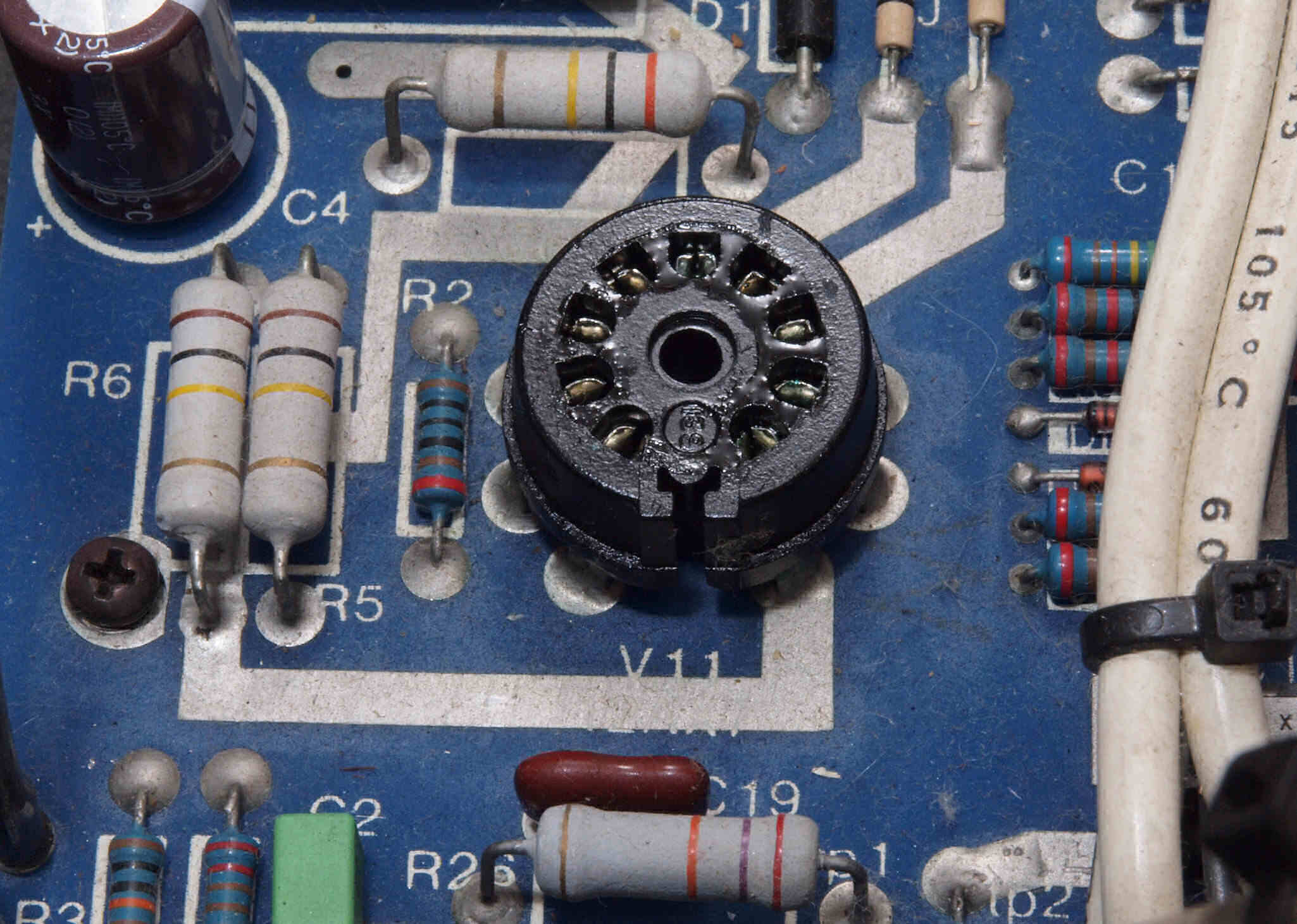 | C117. 修理中 終段6LF6基板。電源トランスとの接続端子。 ピンに緑青が発生している。 | ||||||||||||||||||||||