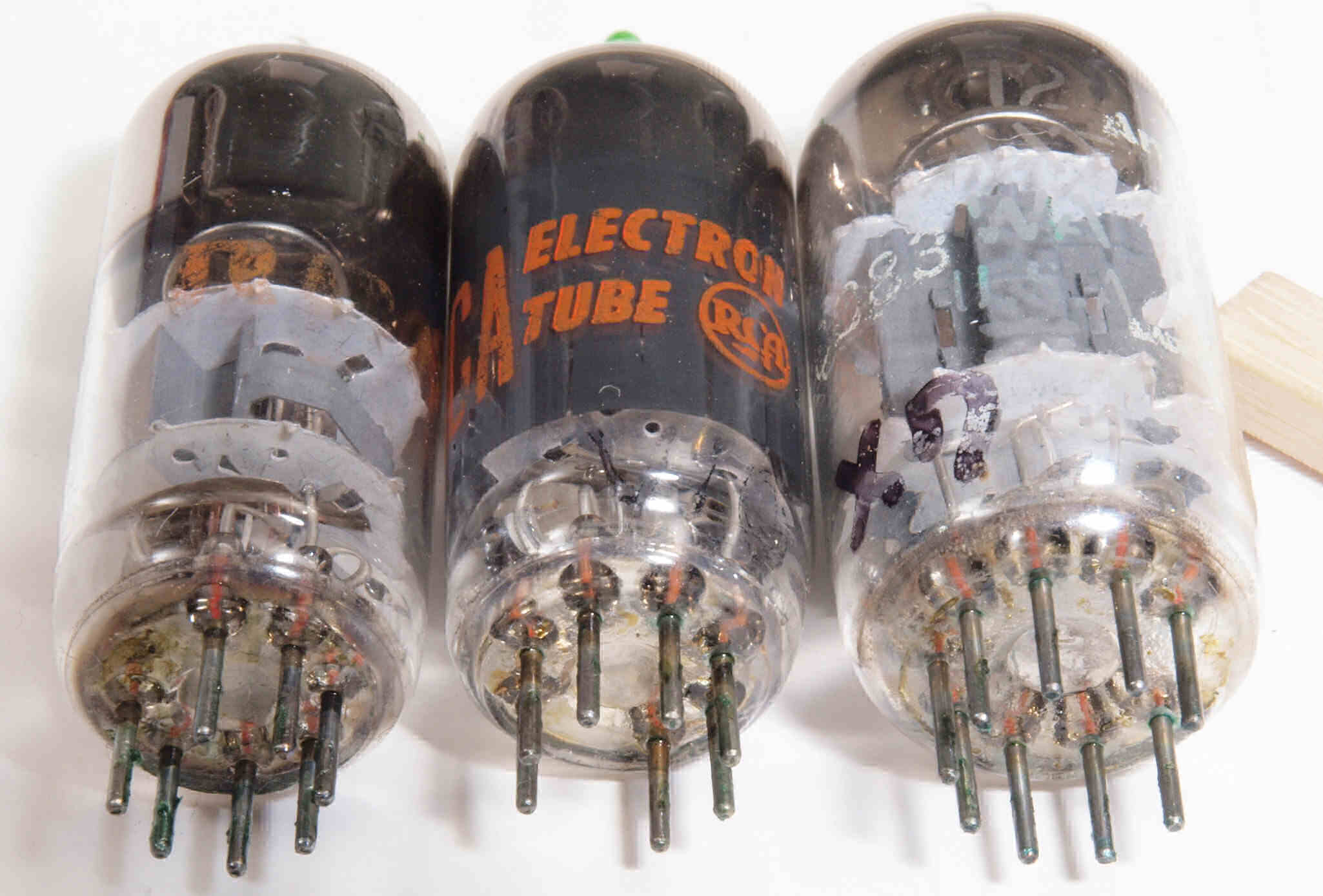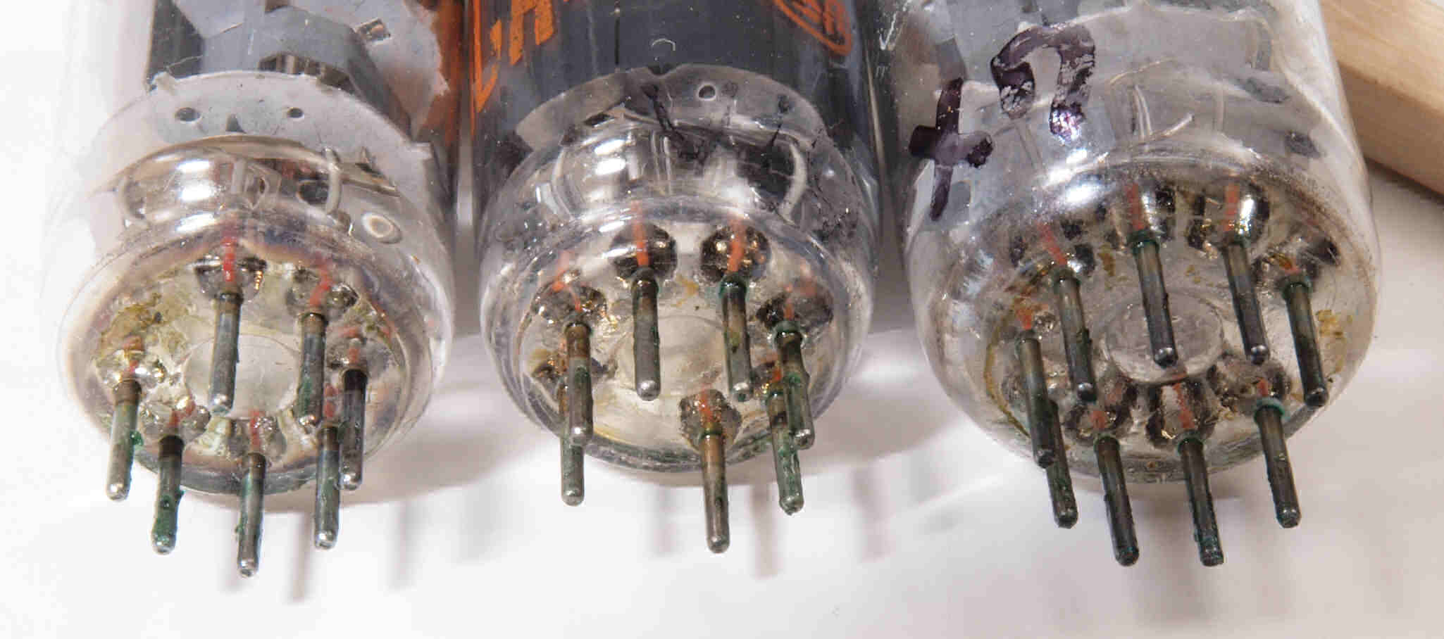 | A42. 点検中 強力な接点復活材を使用したので真空管足に緑青が発生、拡大。左からECC83、6FS5 2本。 | ||||||||||||||||||||||