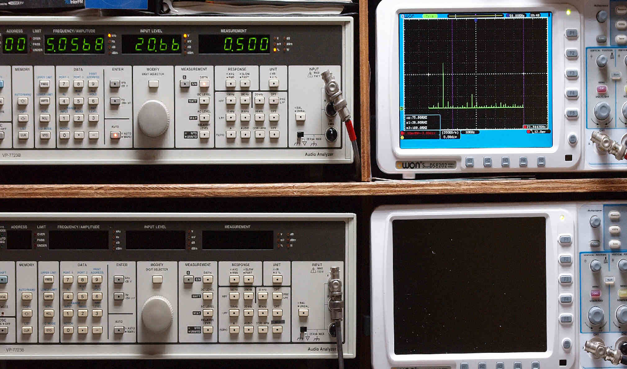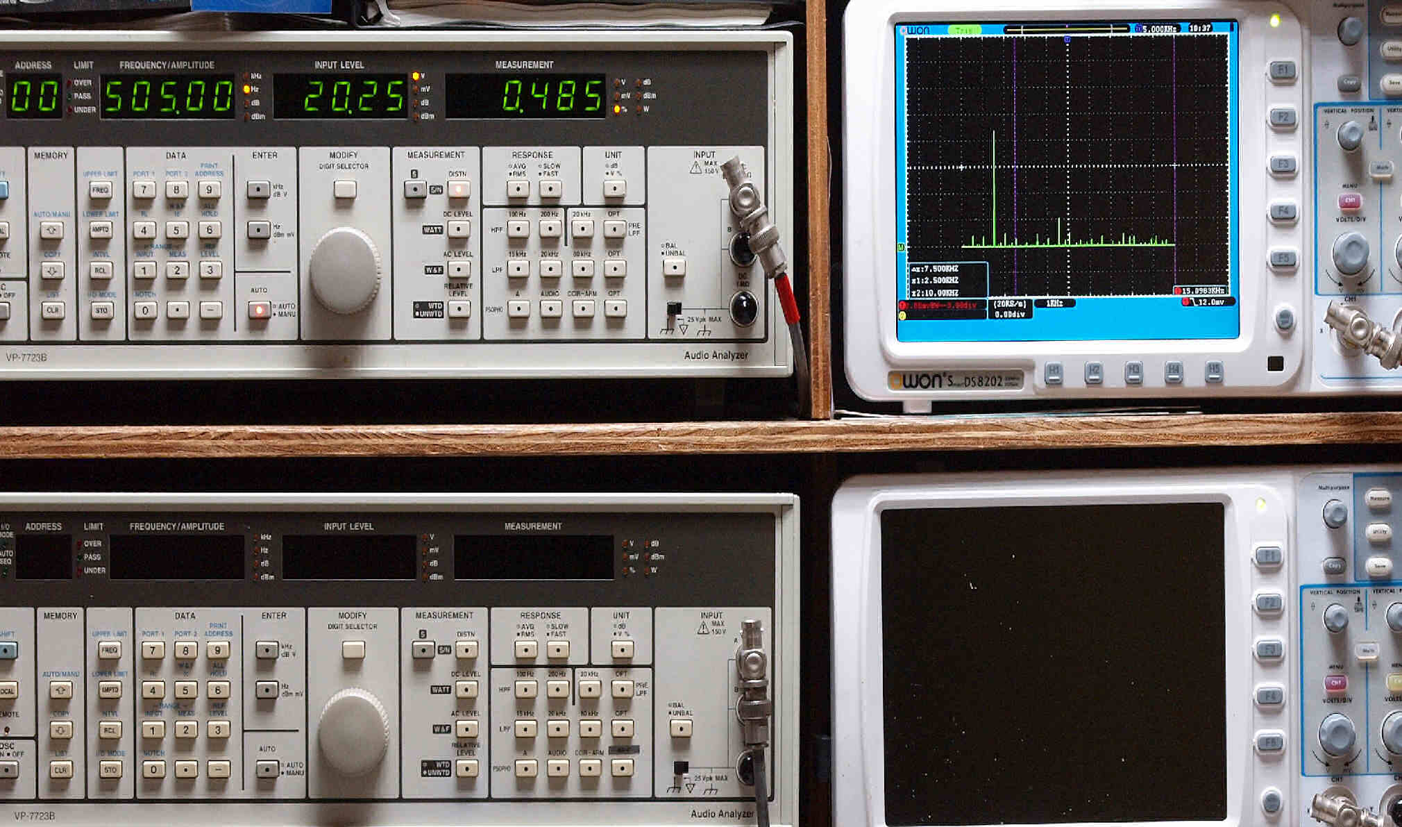 上段右端 VP−7723Bの基本波除去出力を「owon SDS8202(200MHZ)」で「FFT分析」表示。