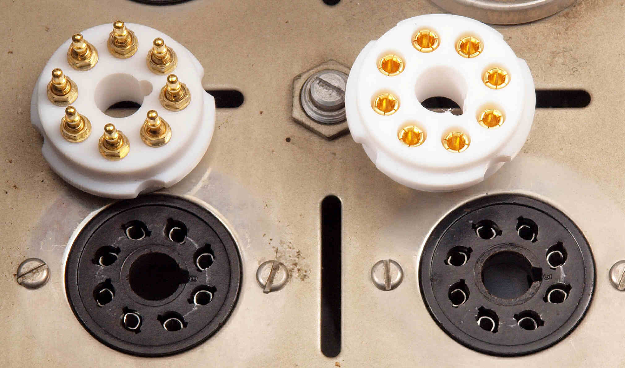 A81. 点検中 6AN8用MTソケット。 上=タイト製MTソケット、下=ベーク製MTソケット。