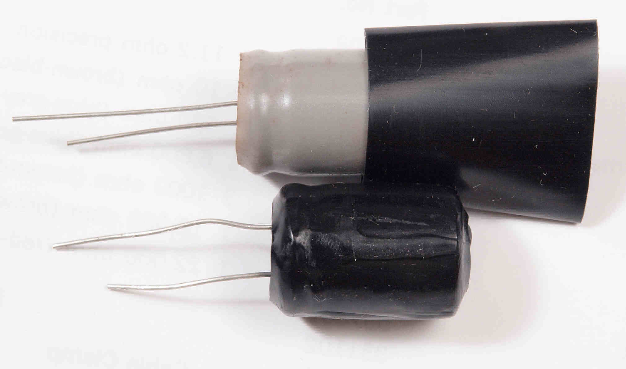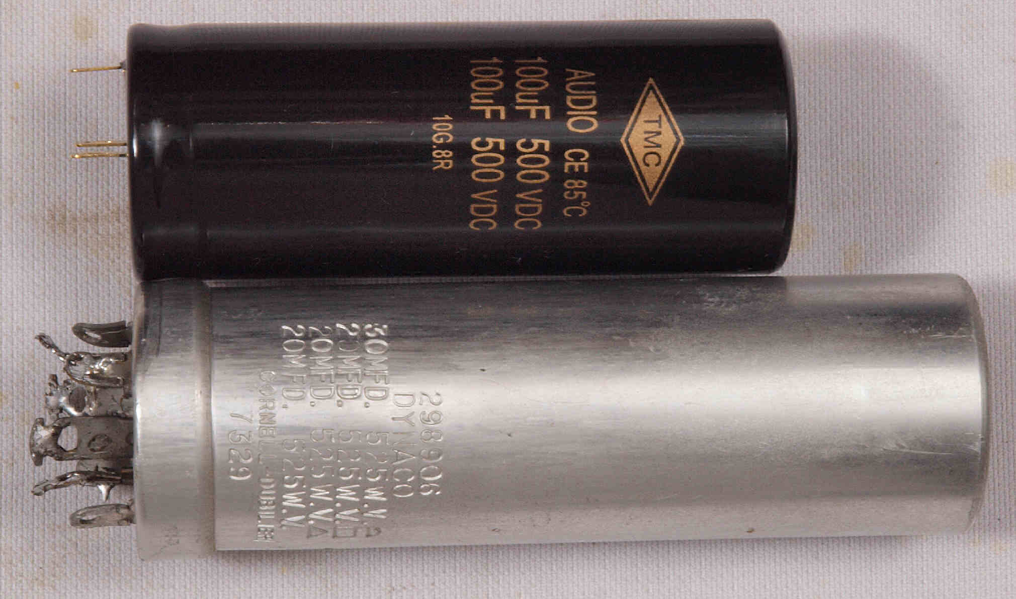 上=交換した 100μ×2/500V、下=付いていた 30μ+20μ×3/525V。