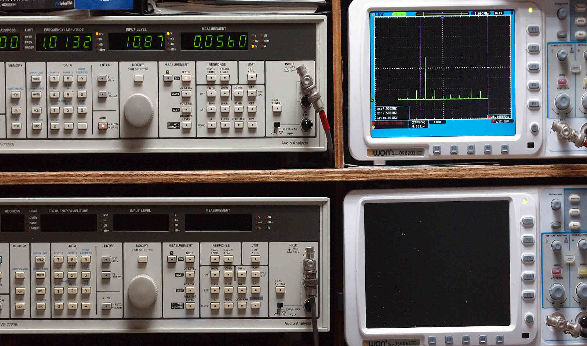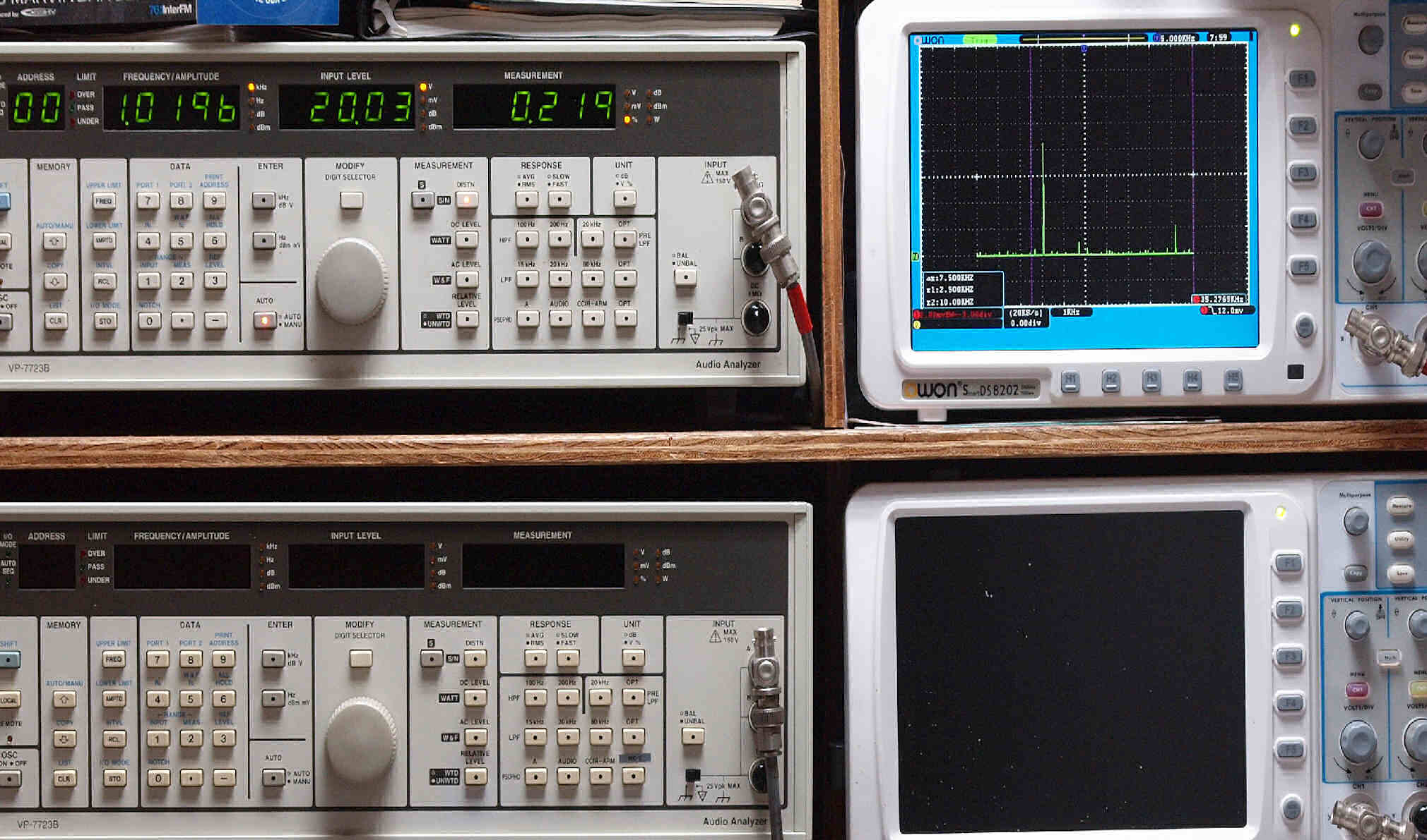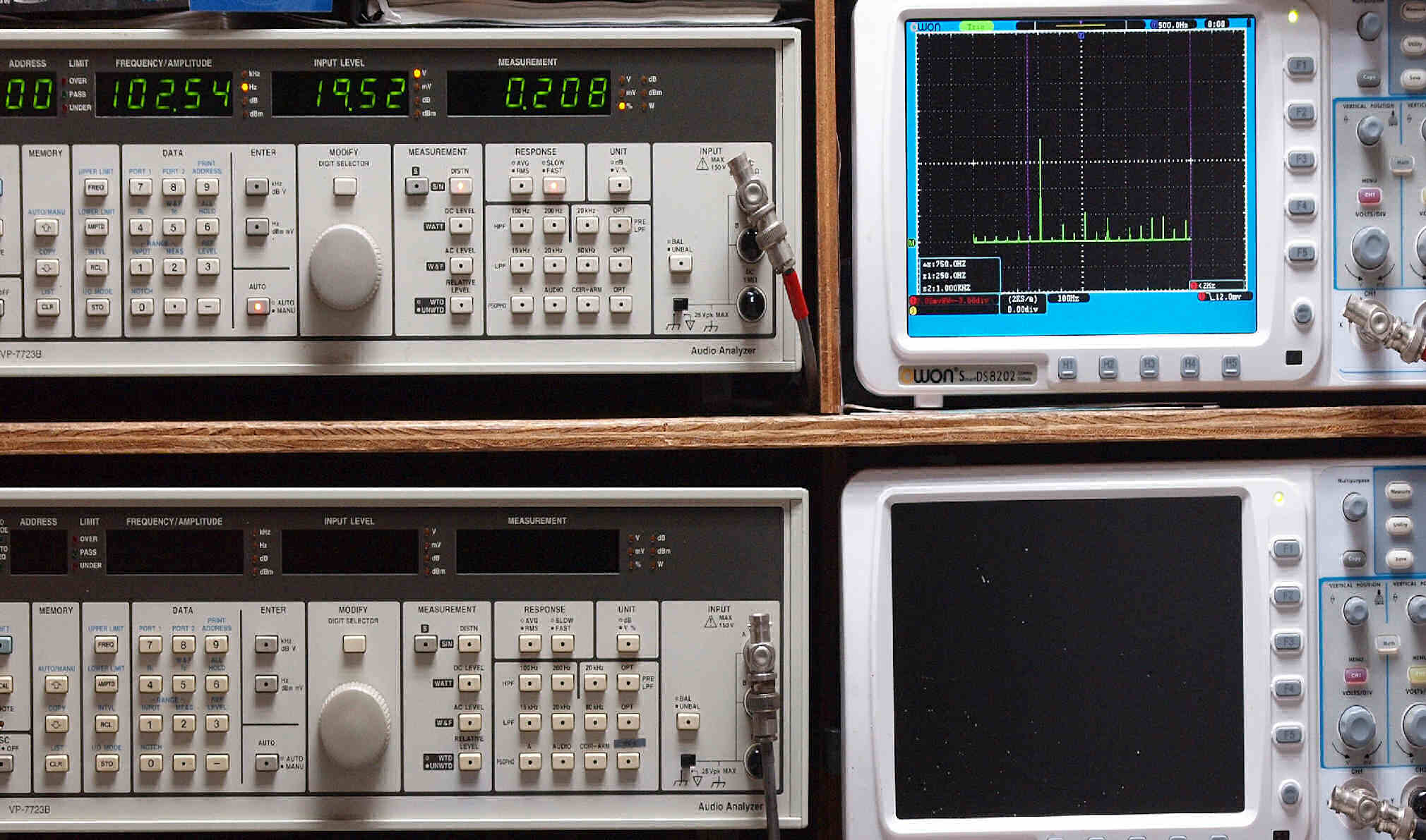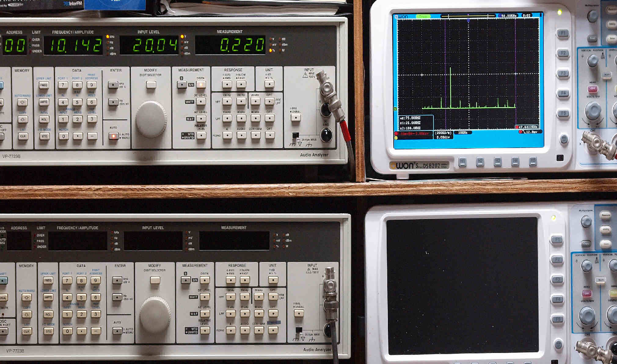 上段右端 VP−7723Bの基本波除去出力を「owon SDS8202(200MHZ)」で「FFT分析」表示。