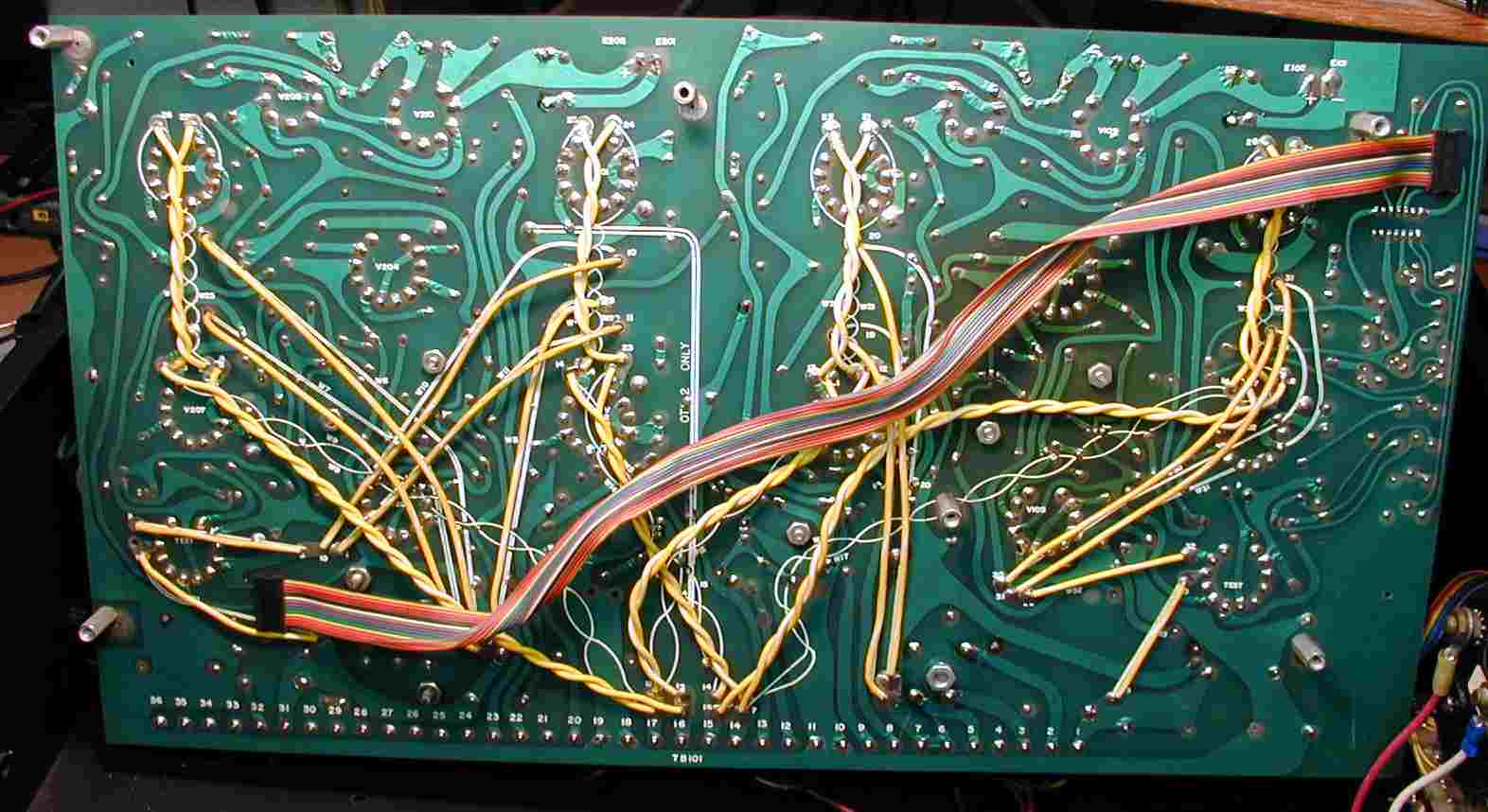 | 3.基板裏、スルフォ−ル基板、黄色の撚り配線はヒ−タ配線、半田補正10ヶ所。 |