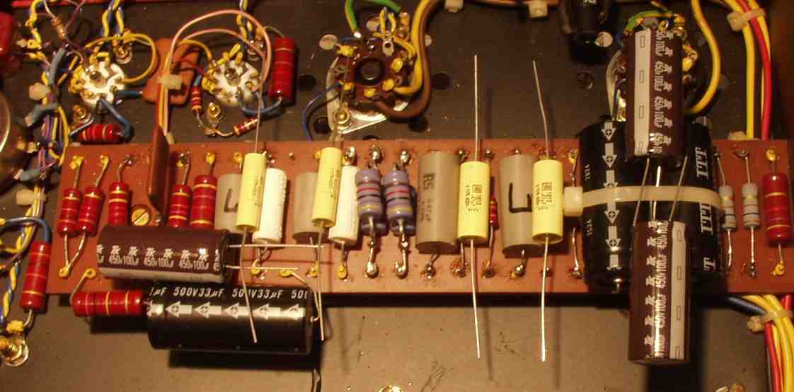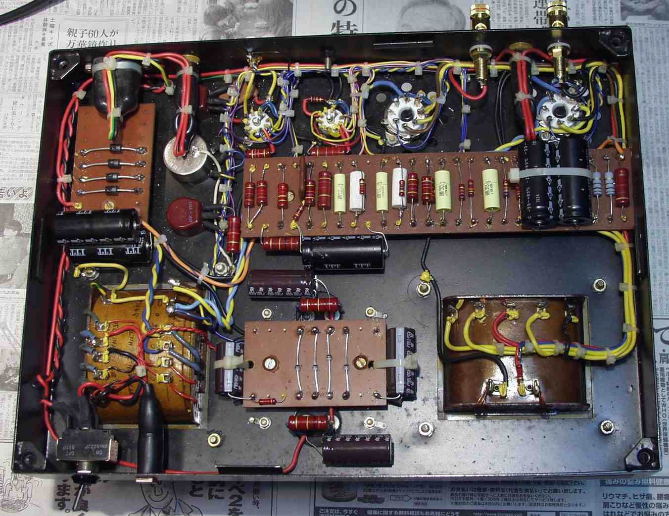 又、右側KT−88のヒ−タ−配線を増強する(左のUSソケットに入る空色/黄色の線) |