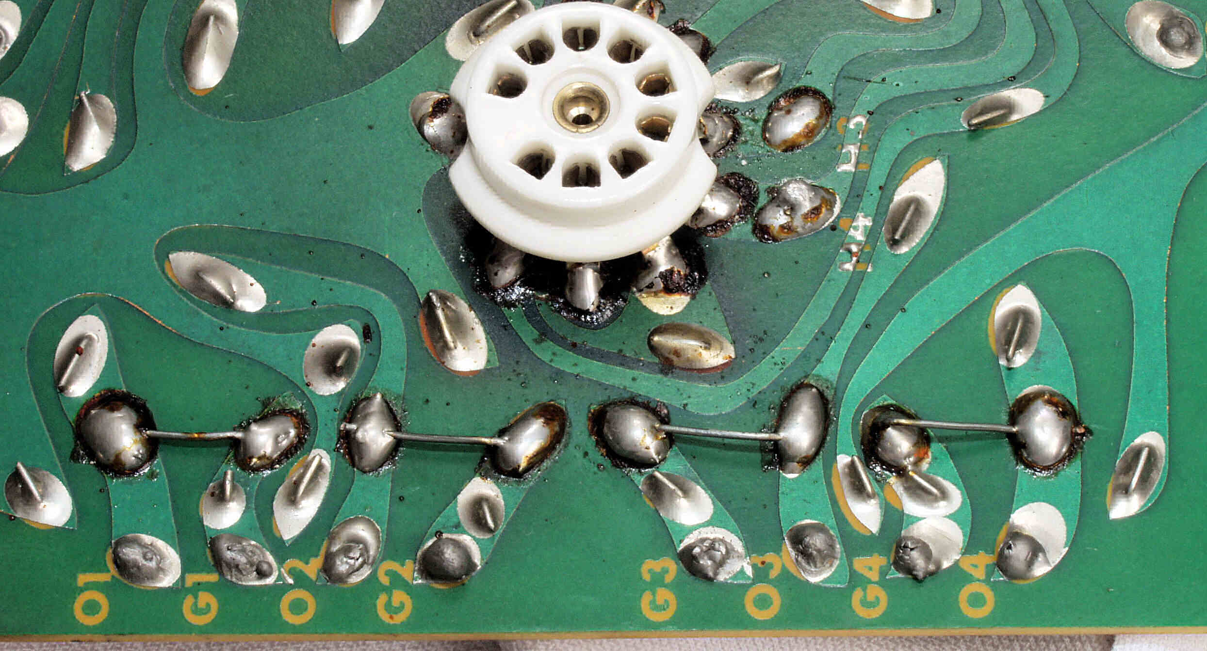 A54. 点検中 前段AMP基板から出力真空管6336への配線。 今にも取れそう。有鉛半田と無鉛半田の混在は不可!
