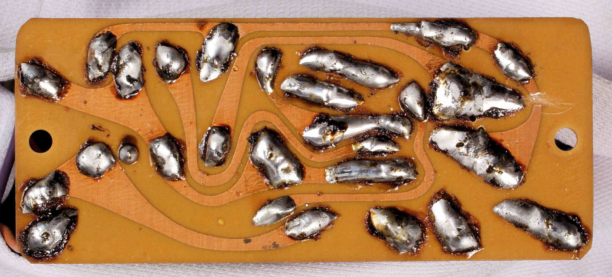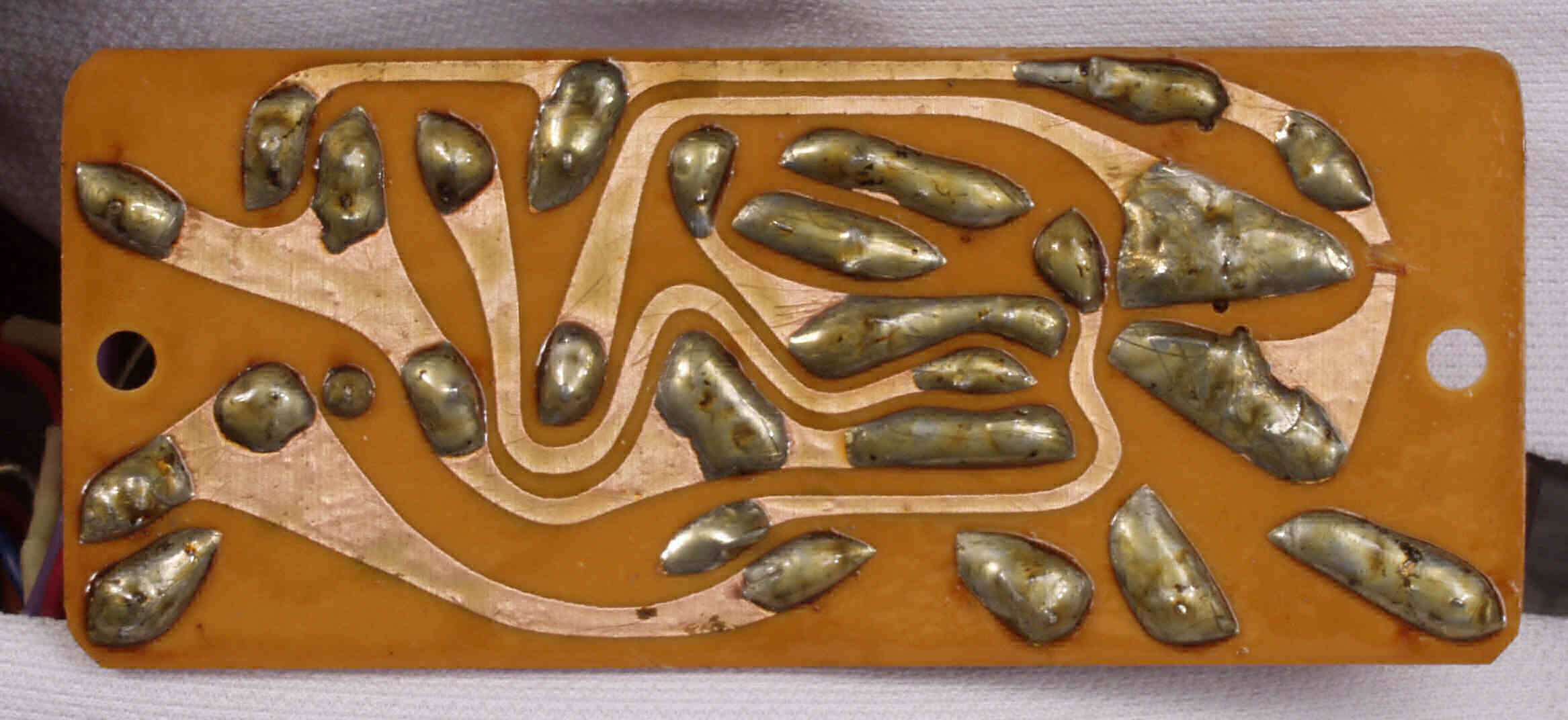 C345. 修理中 前段AMP基板裏。銅箔はく離をしている部分。