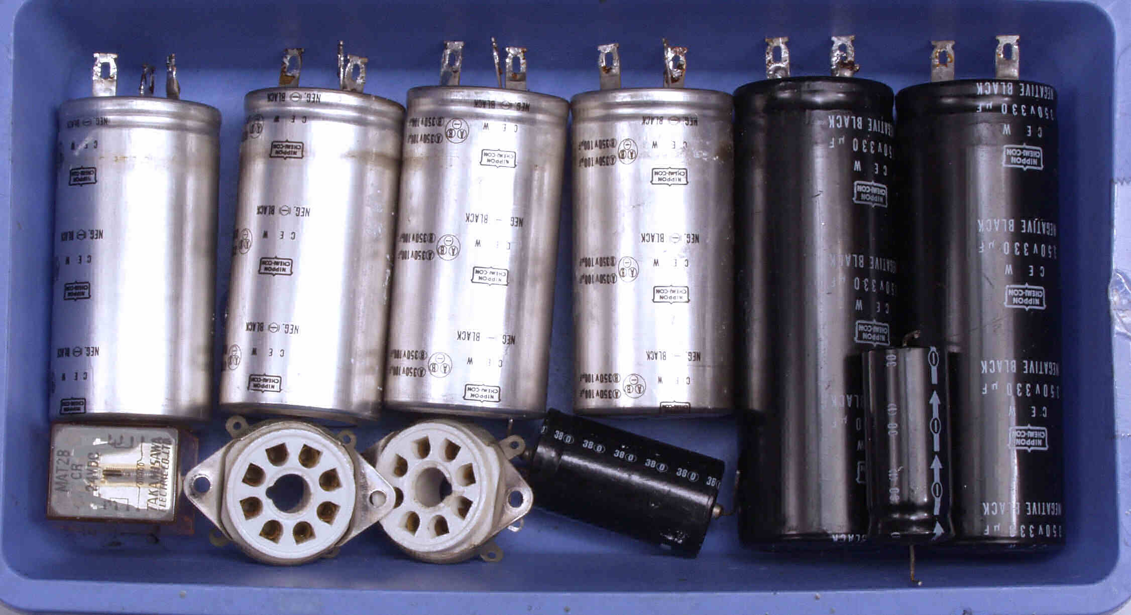 C62. 修理中 ブロック電解コンデンサー容量測定。6336プレート電圧平滑用2=330μ/350V、大分絶縁が低下している。
