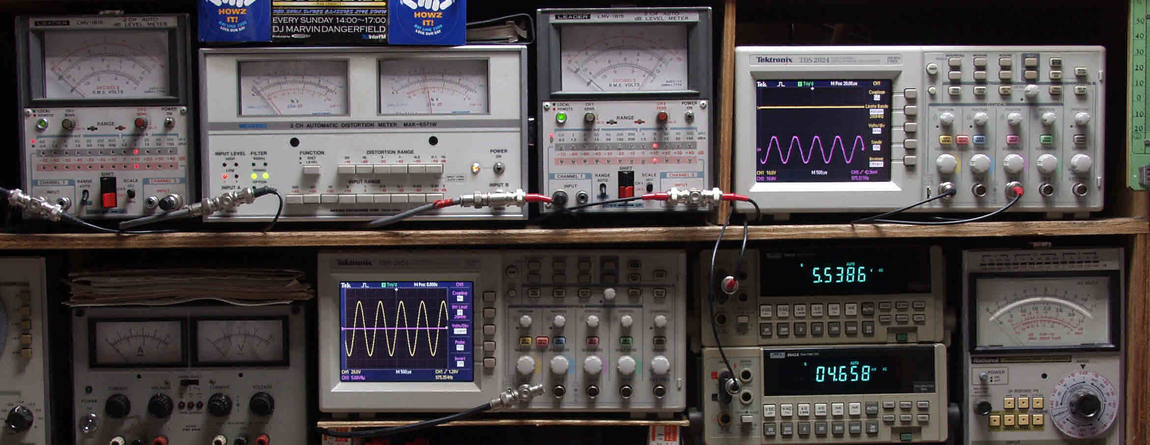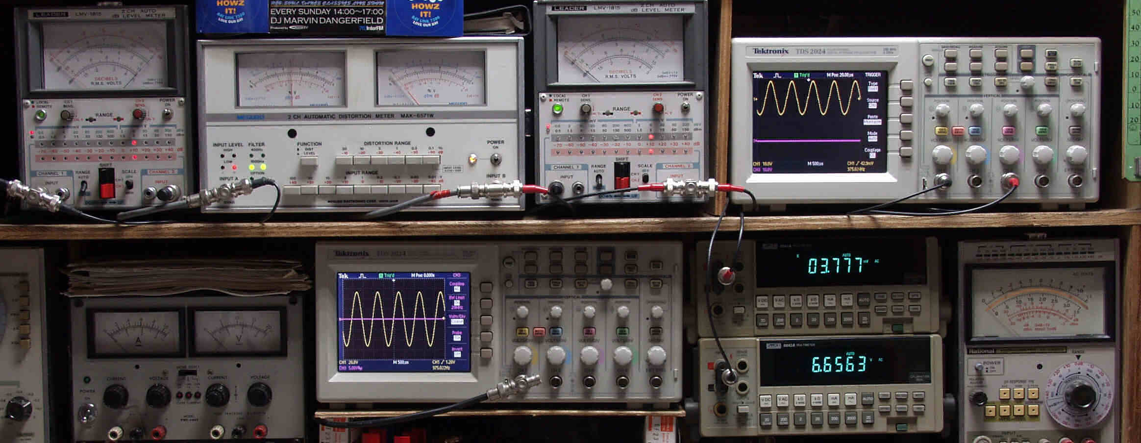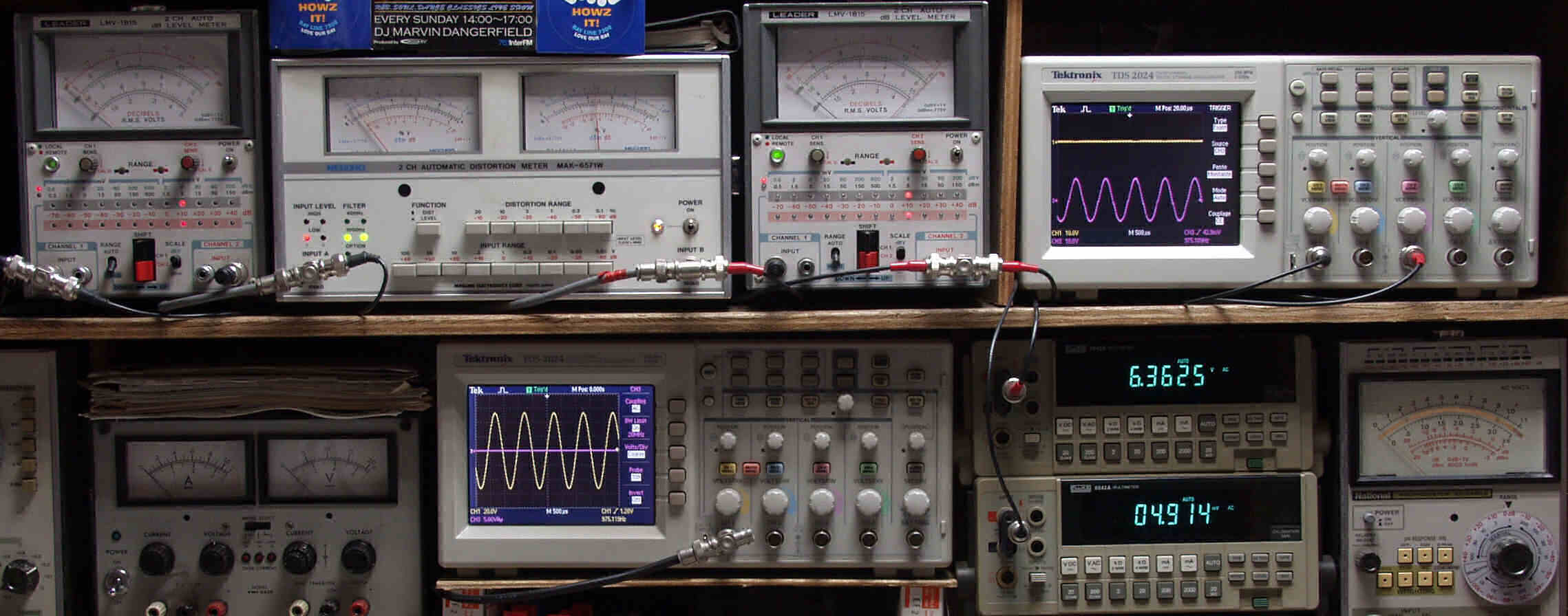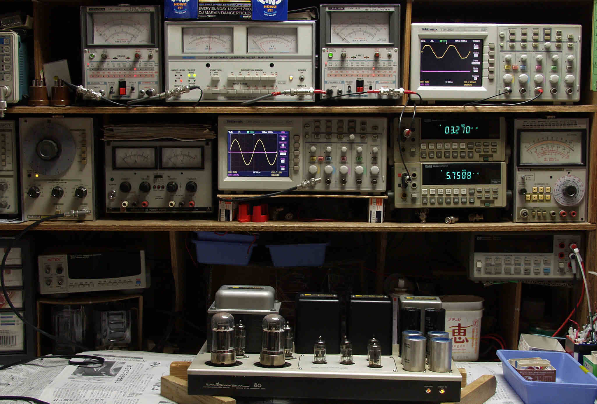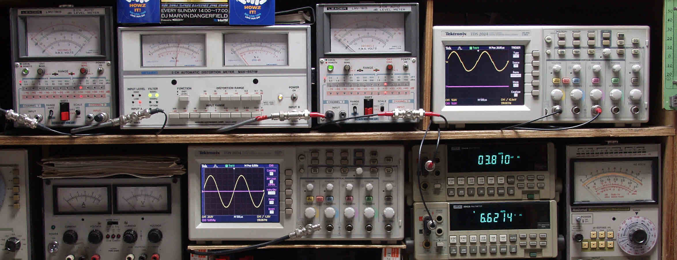 上段中左 歪み率計=出力の歪み率測定 左メータ=L出力、右メータ=R出力。
