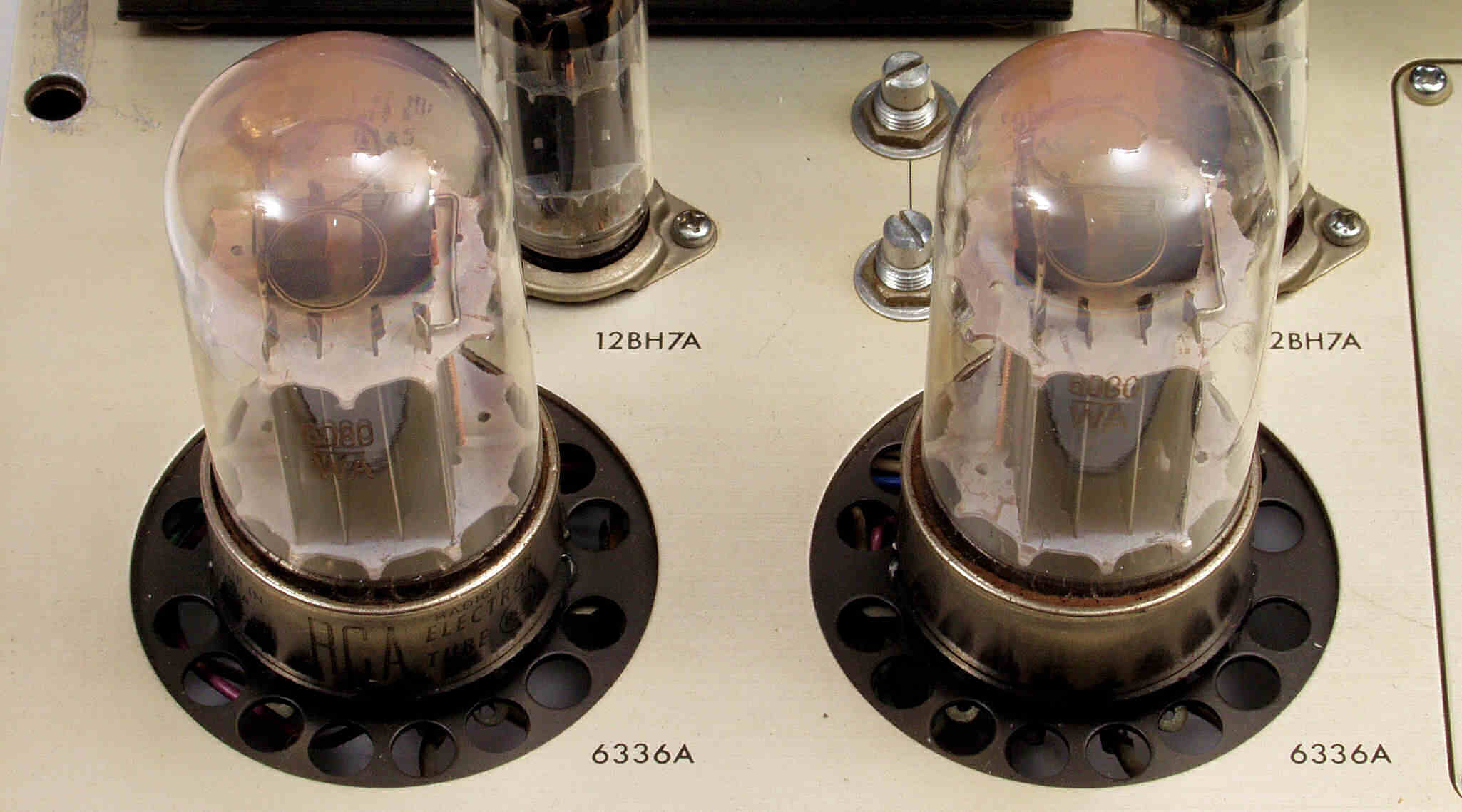 A61. 点検中 「終段出力真空管6336A」を見る。 ゲーターが薄く中が見える!
