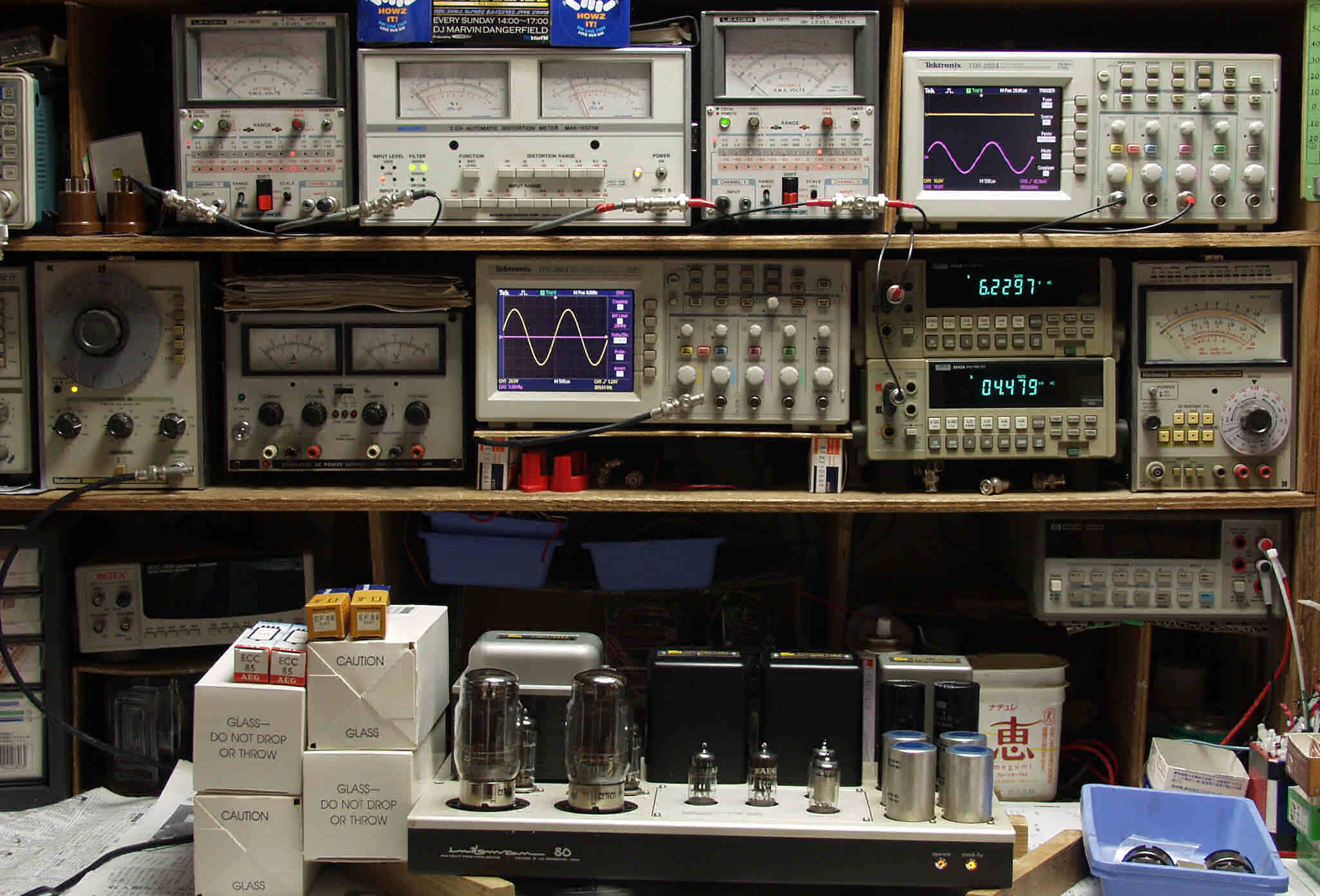 下段左端 オーディオ発振器より400HZ・1KHZの信号を出し(歪み率=約0.003%)これをAMPに入力し、出力を測定。
