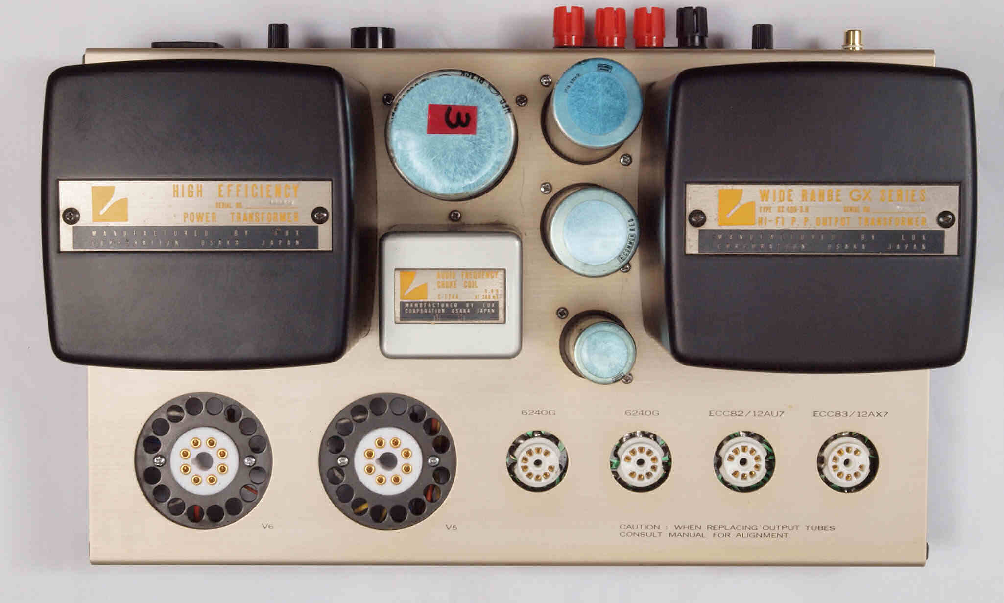 CA5 完成前上から見る。8045G2本、6240G2本、12AU7、12AX7。