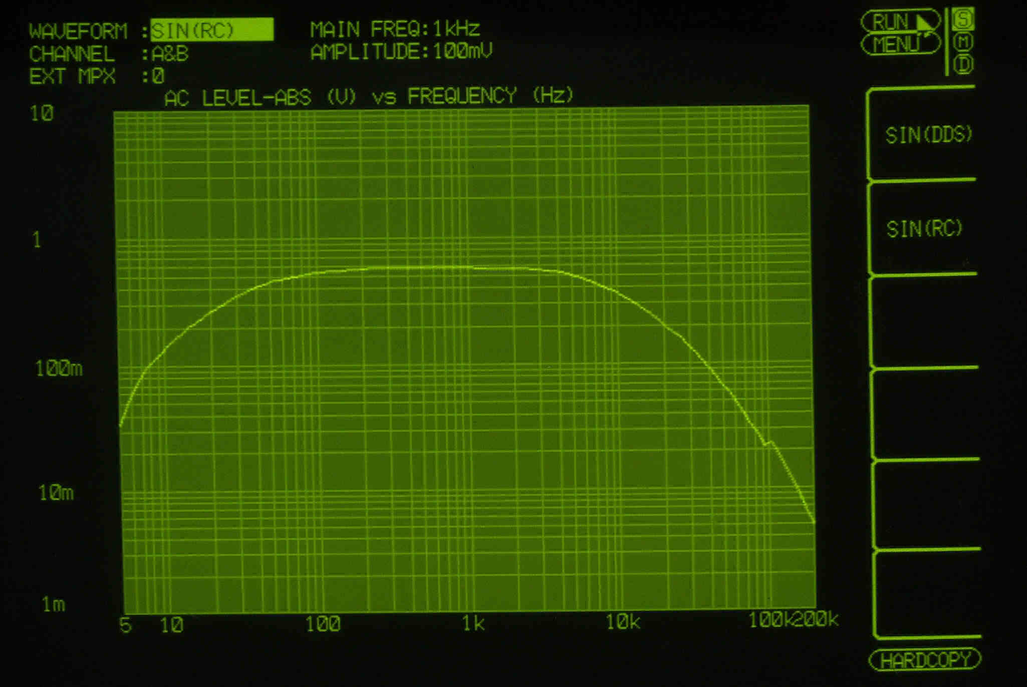 AUX入力端子へ100mV一定入力、VRはmax、左出力=薄(細い)色 右出力=濃い(太い)色