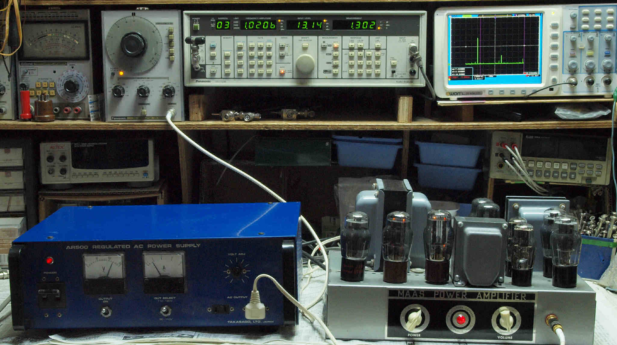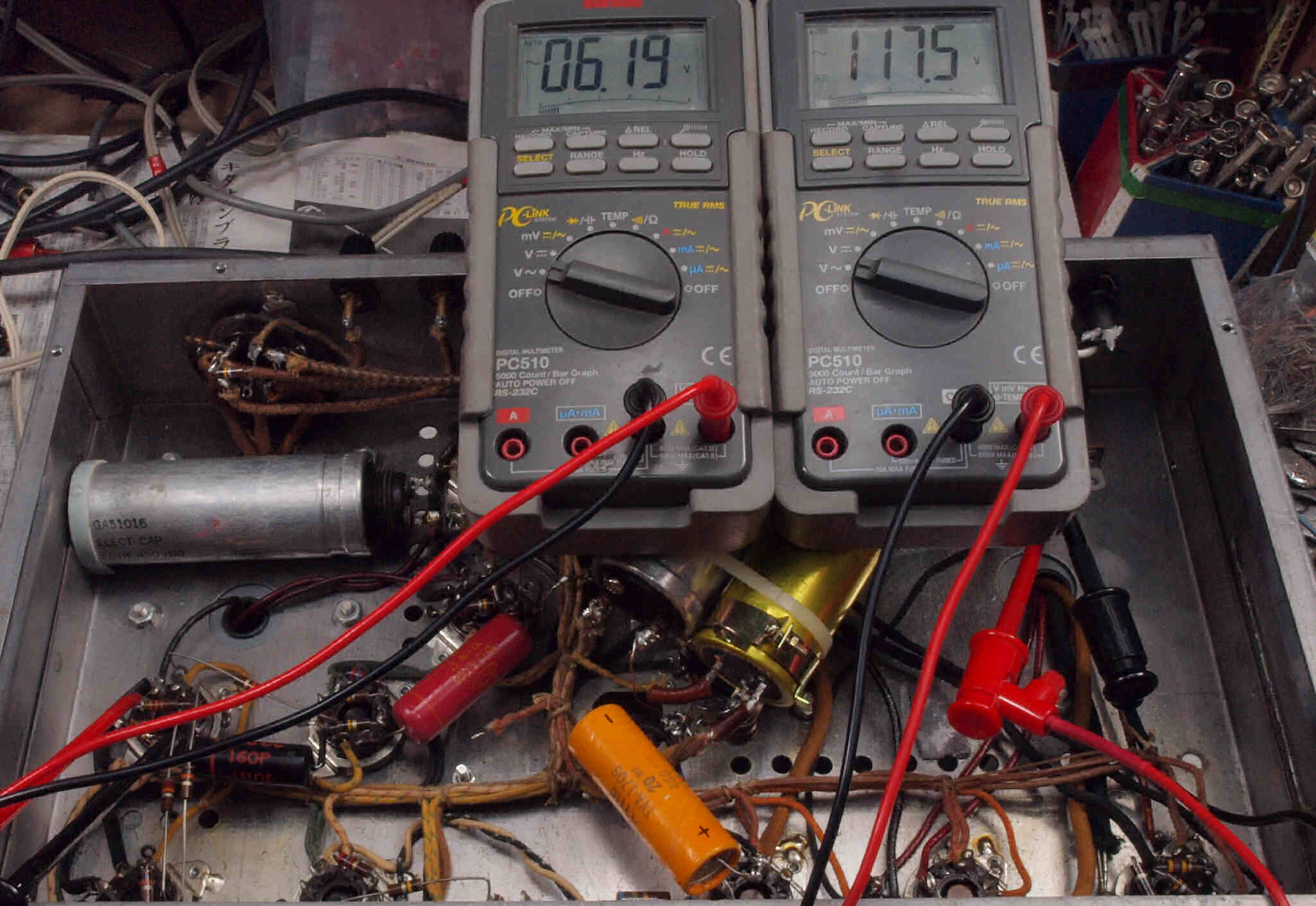 | P. 電源トランス点検。画像をクリックすると、大きく(横幅2050ドット)表示されます。 可変周波数・電圧電源を使用する。 真空管は全て付属。 右マルチメーター=電源電圧=117.5、左マルチメーター=ヒーター電圧=6.19。 |