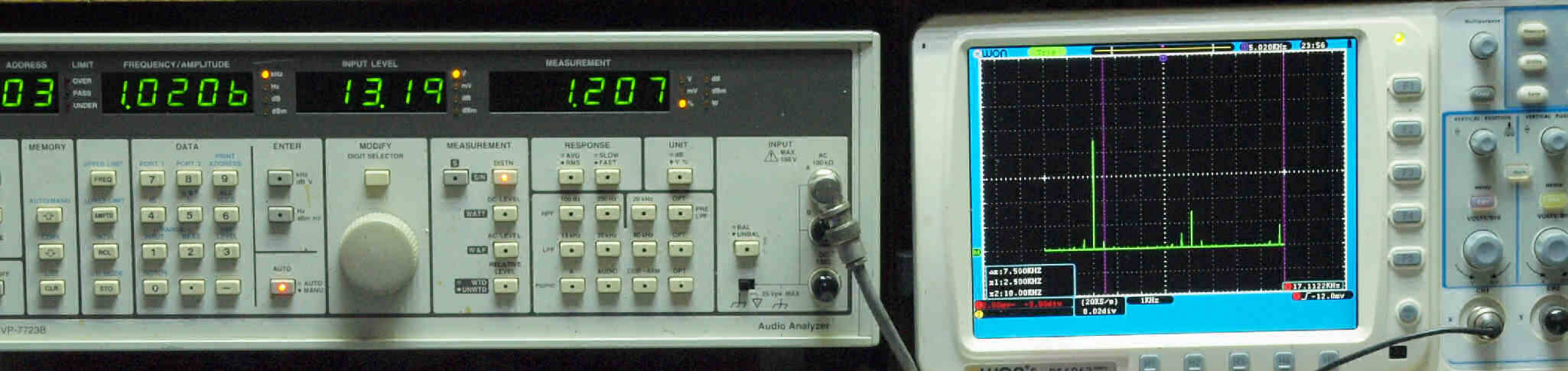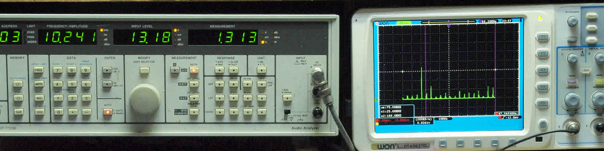 | T. バラック修理後点検測定。画像をクリックすると、大きく(横幅2050ドット)表示されます。 T0. 出力・歪み率測定・調整。 117Vで測定。 「見方」。 中 SP出力を「Audio Analyzer Panasonic VP−7723B」により測定。 表示LED、 左端=メモリーNo、 中左=周波数測定、 中右=出力電圧測定、 右端=歪み率測定。 右端 VP−7723Bの基本波除去出力を「owon SDS6062(200MHZ)」で「FFT分析」表示。 左端 オーディオ発振器 VP−7201A より50Hz〜100kHzの信号を出し(歪み率=約0.003%)、ATT+分配器を通し、AMPに入力。 よって、ダイアル設定出力レベルより低くなります。測定機器の仕様や整備の様子はこちら、「VP−7723B」「VP−7201A」。 FFT画面の見方はこちら。 |