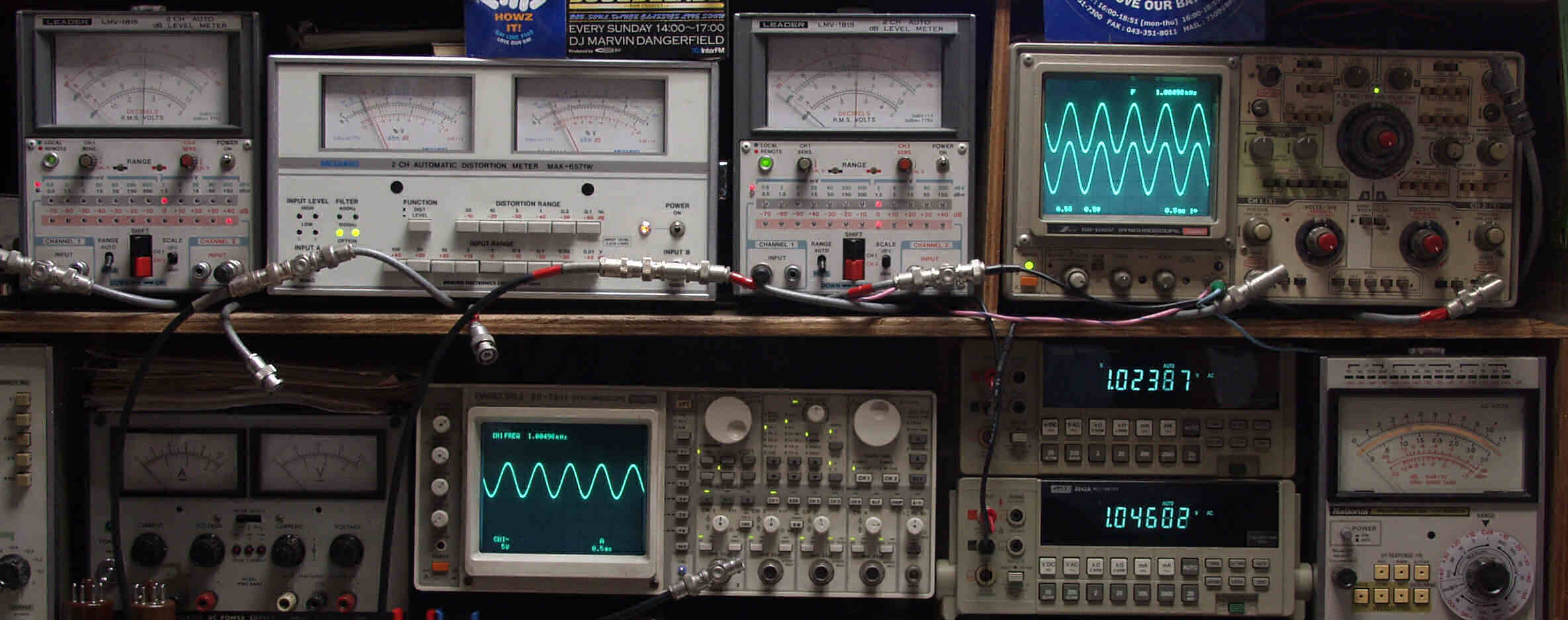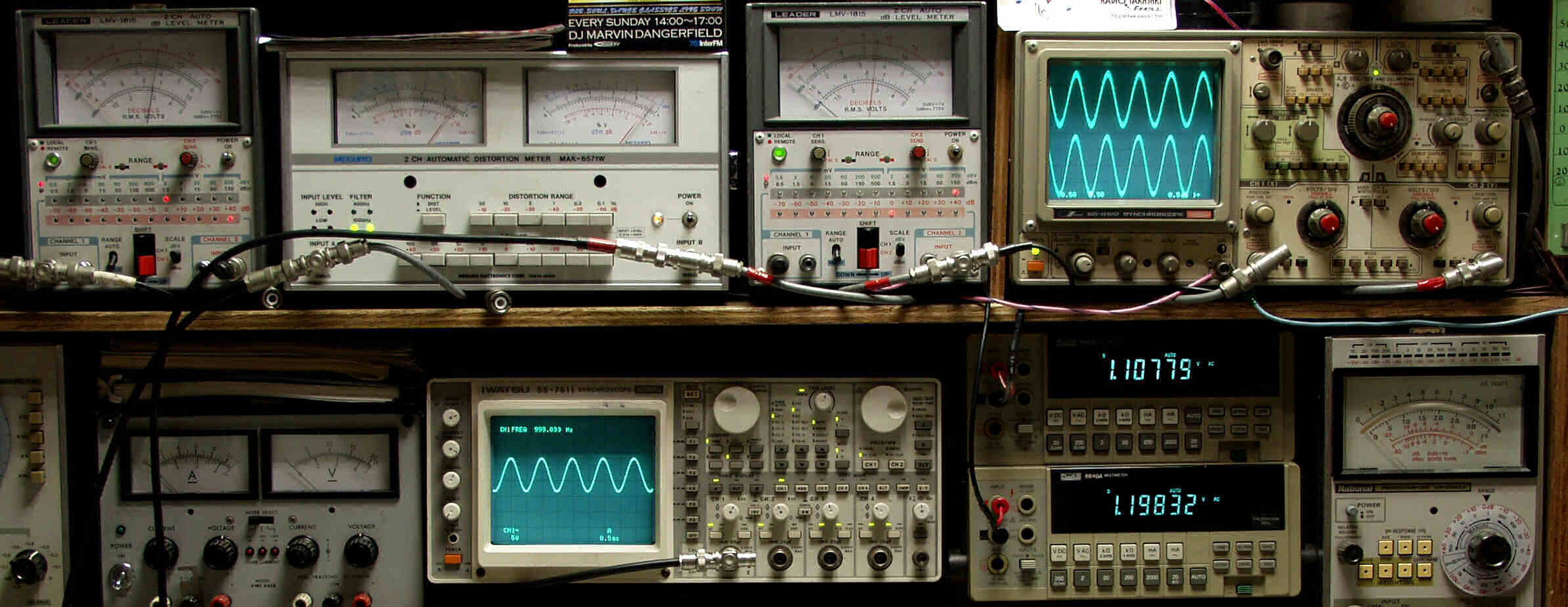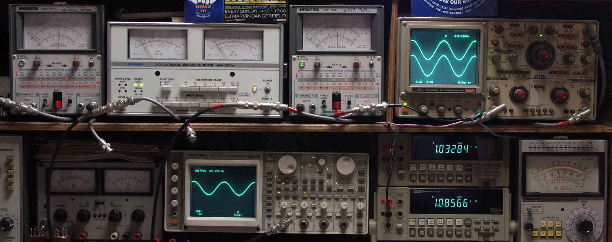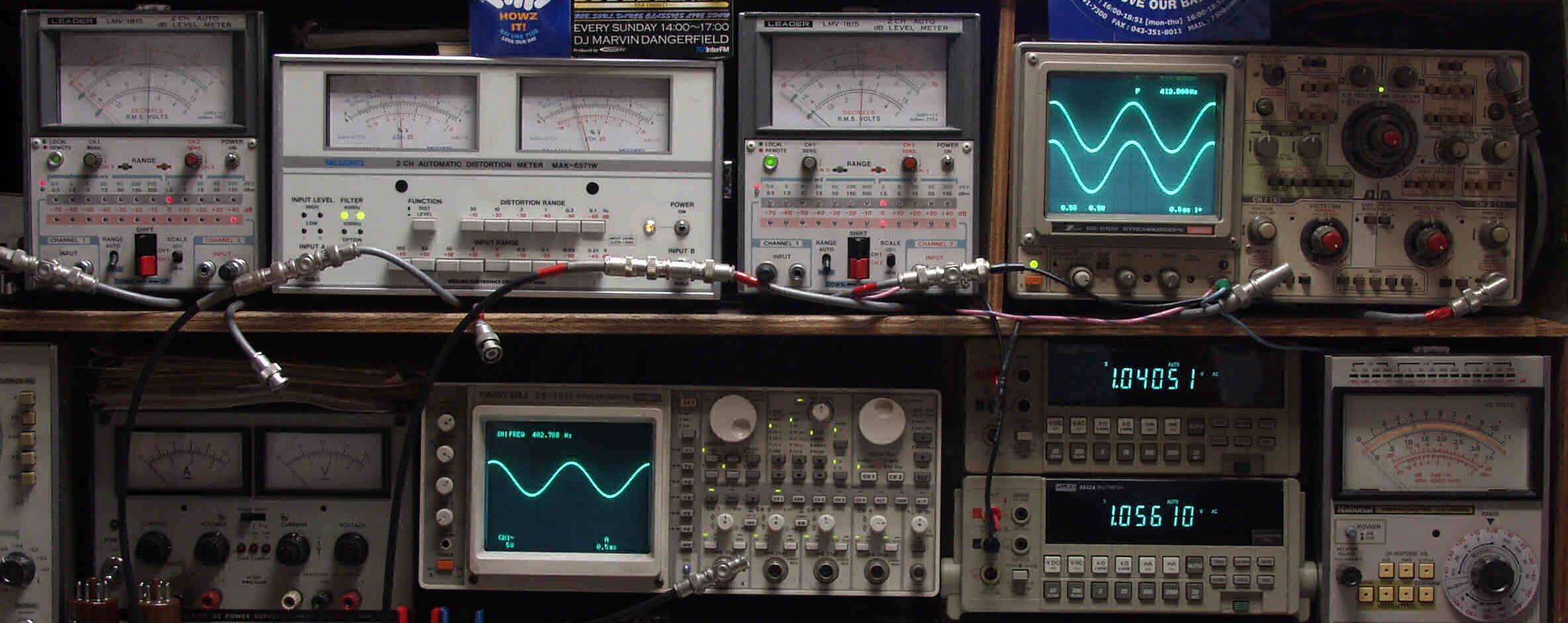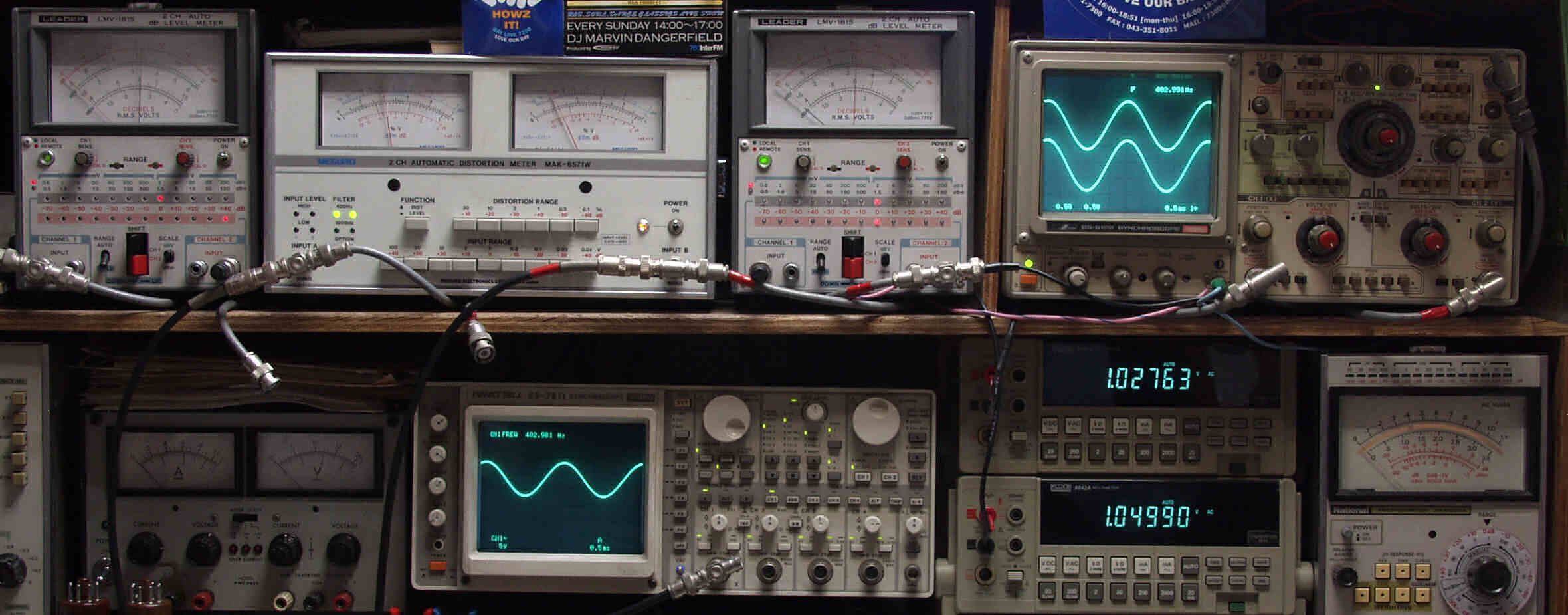 | T. 修理前点検測定 T1. 出力・歪み率測定 <見方> 下段左端 オーディオ発振器より400HZ・1KHZの信号を出し(歪み率=約0.003%)これをAMPに入力し、出力を測定 下段中左 オシロ=入力波形(オーディオ発振器のTTLレベル) 下段中右上=周波数計 上段左端 電圧計=L側出力電圧測定、黒針のみ使用 上段中左 歪み率計=出力の歪み率測定 左メータ=L出力、右メータ=R出力 上段中右 電圧計=R側出力電圧測定、赤針のみ使用 上段右端 オシロ=出力波形 上=R出力、下=L出力(実際にはRL電圧計の出力「Max1V」を観測) 下段中右上 デジタル電圧計=R出力電圧測定 下段中右下 デジタル電圧計=L出力電圧測定 |
