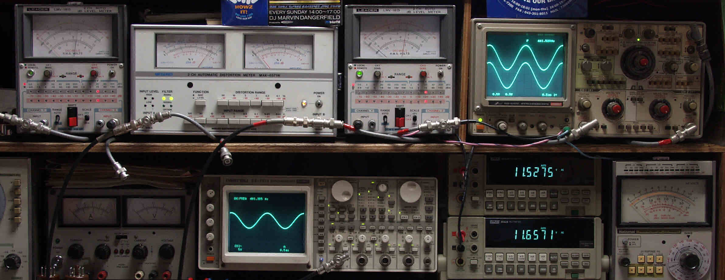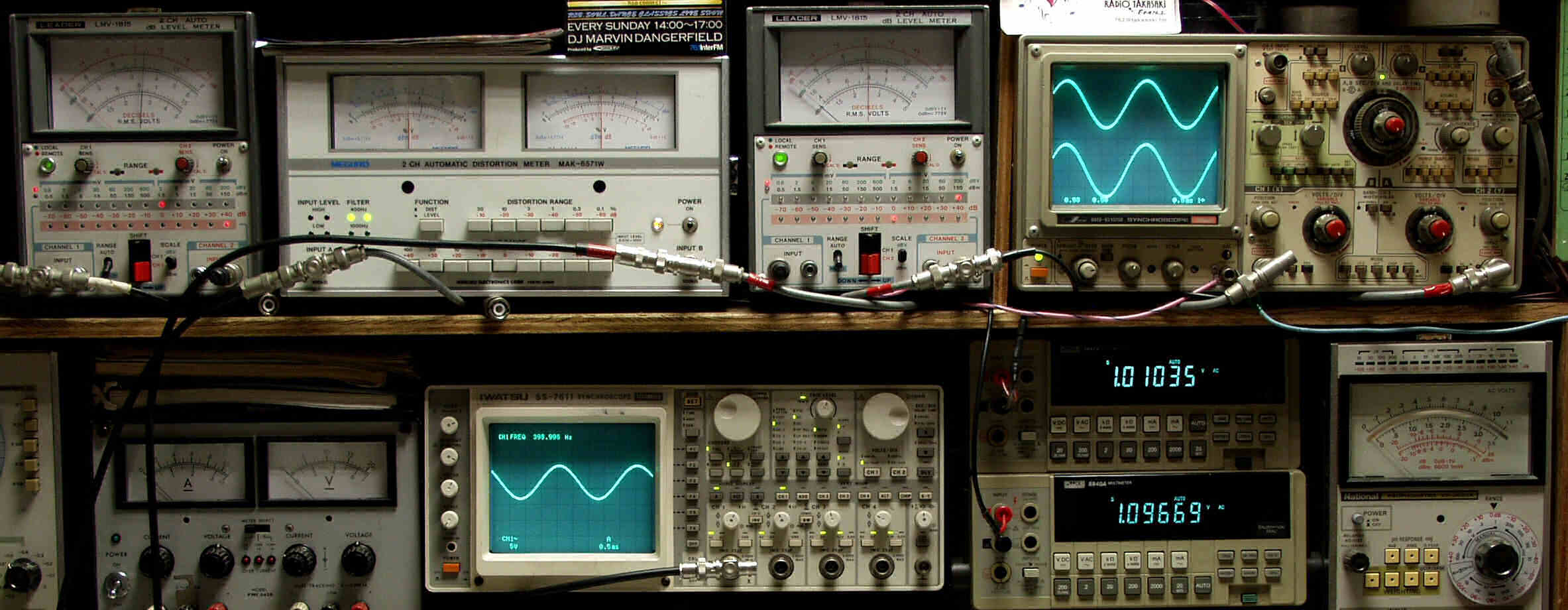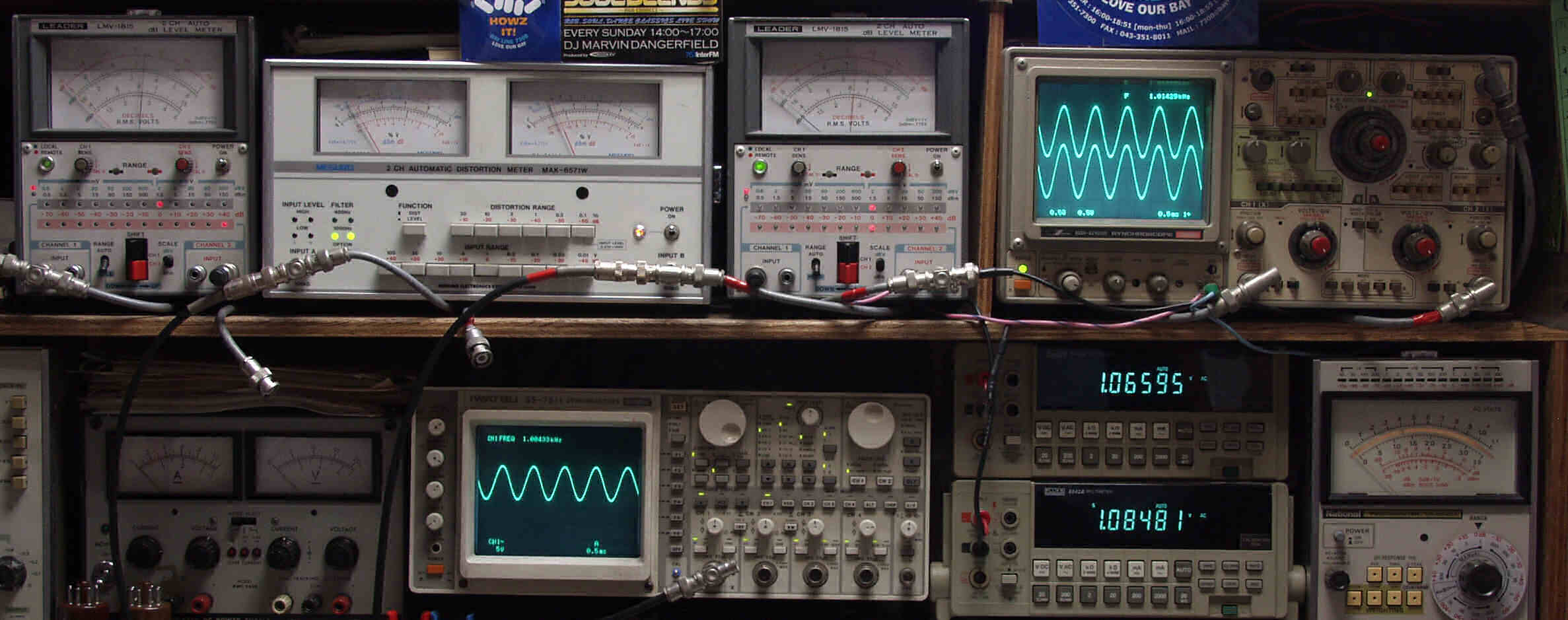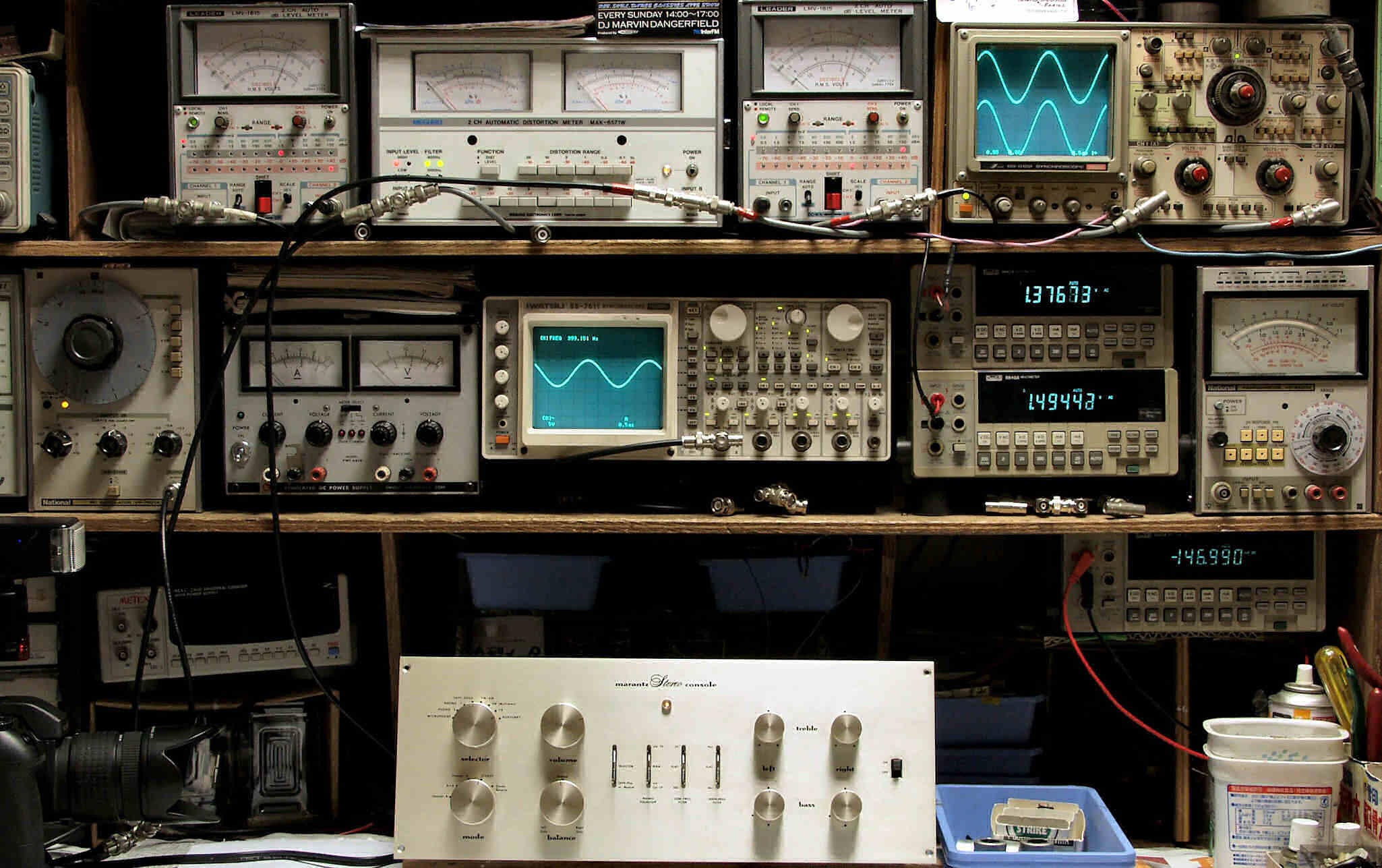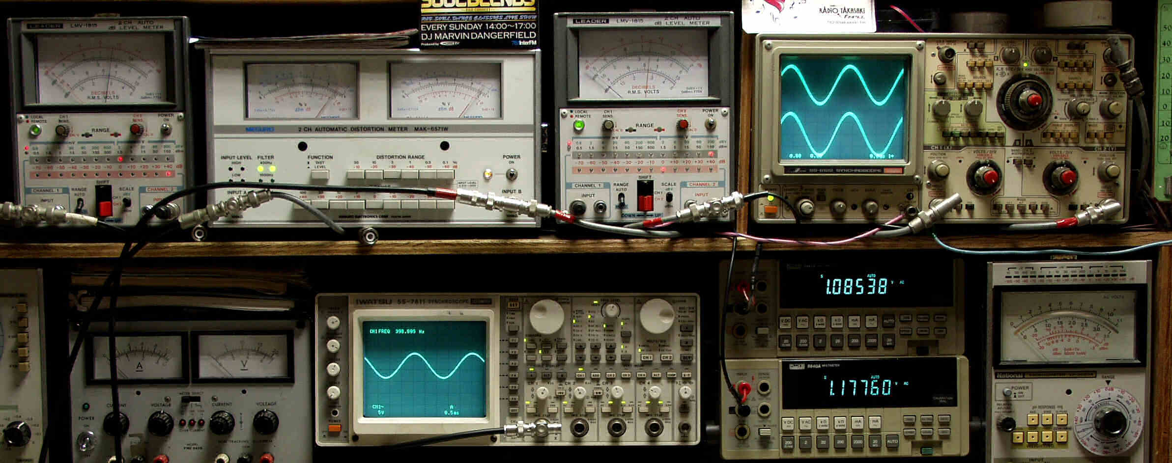 | T. 修理前点検測定 T1. 出力・歪み率測定 <見方> 下段左端 オーディオ発振器より400HZ・1KHZの信号を出し(歪み率=約0.003%)これをAMPに入力し、出力を測定 下段中左 オシロ=入力波形(オーディオ発振器のTTLレベル) 下段中右上=周波数計 上段左端 電圧計=L側出力電圧測定、黒針のみ使用 上段中左 歪み率計=出力の歪み率測定 左メータ=L出力、右メータ=R出力 上段中右 電圧計=R側出力電圧測定、赤針のみ使用 上段右端 オシロ=出力波形 上=R出力、下=L出力(実際にはRL電圧計の出力「Max1V」を観測) 下段中右上 デジタル電圧計=R出力電圧測定 下段中右下 デジタル電圧計=L出力電圧測定 |