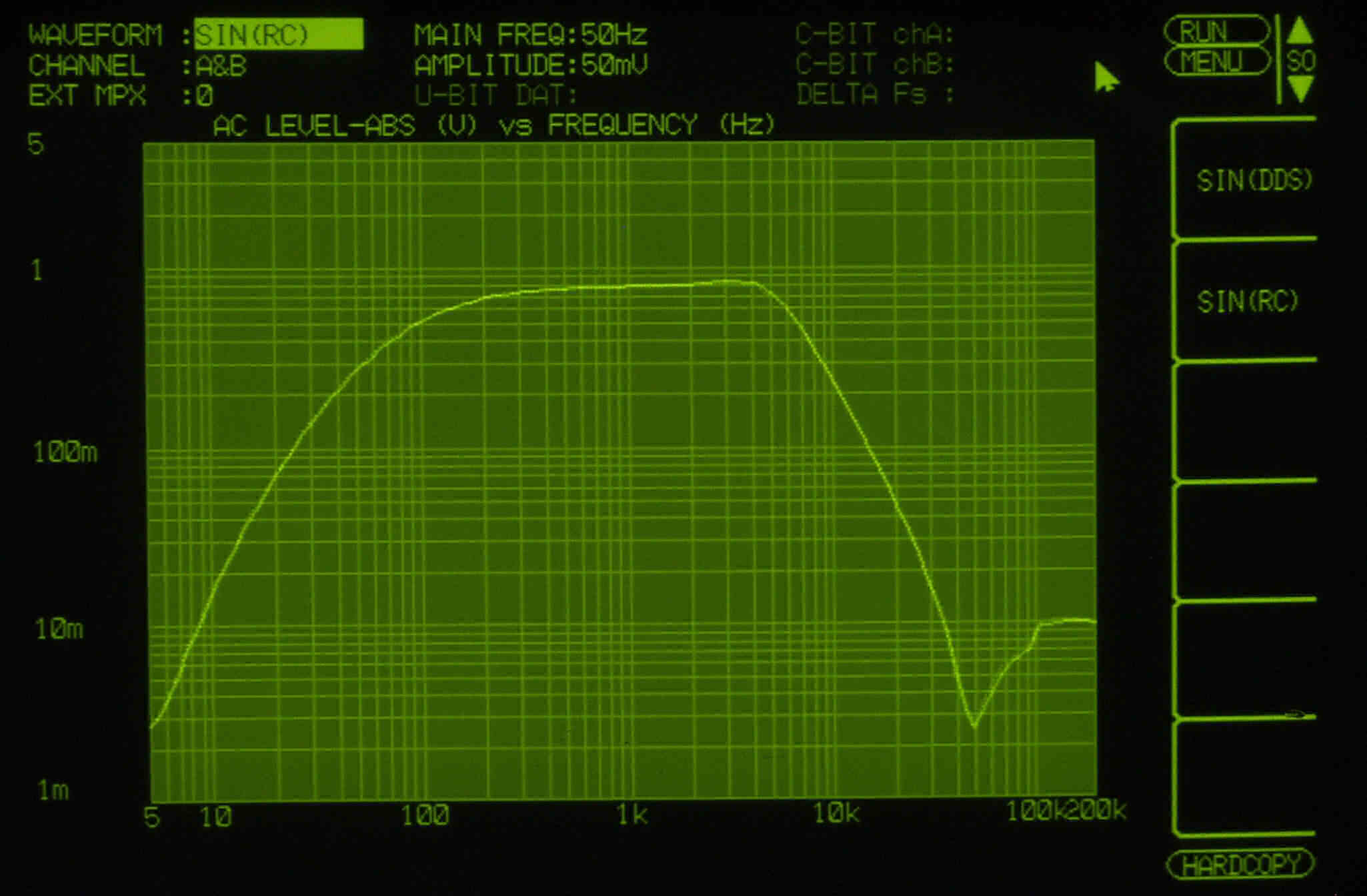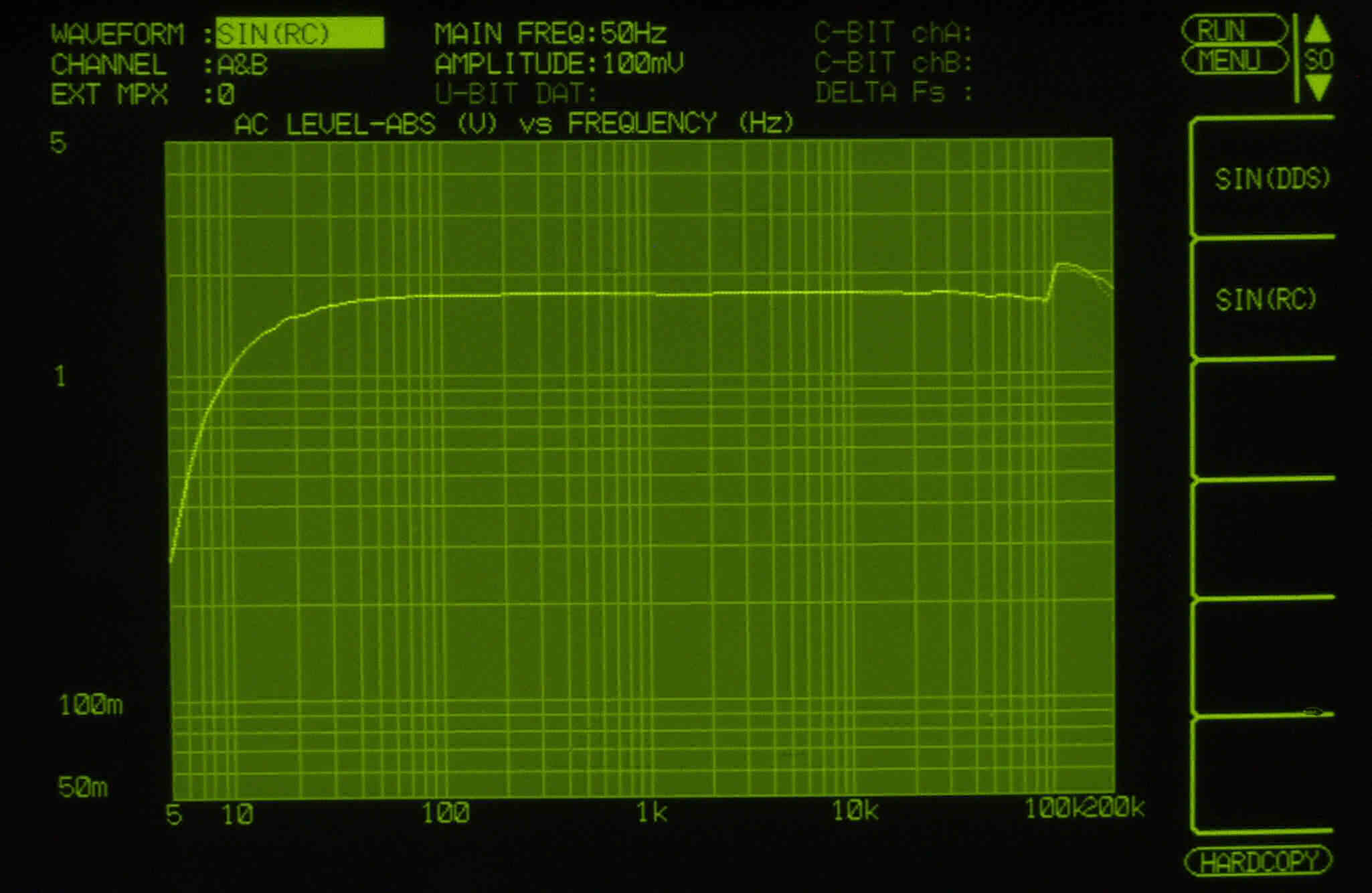 | E42. 出力電圧5V 歪み率=0.9%(測定レンジ=1%) AUX入力 400HZ。 右側は真空管が元気なので、この直ぐ上で飽和する。 | ||||||||||||||||||||||||||||