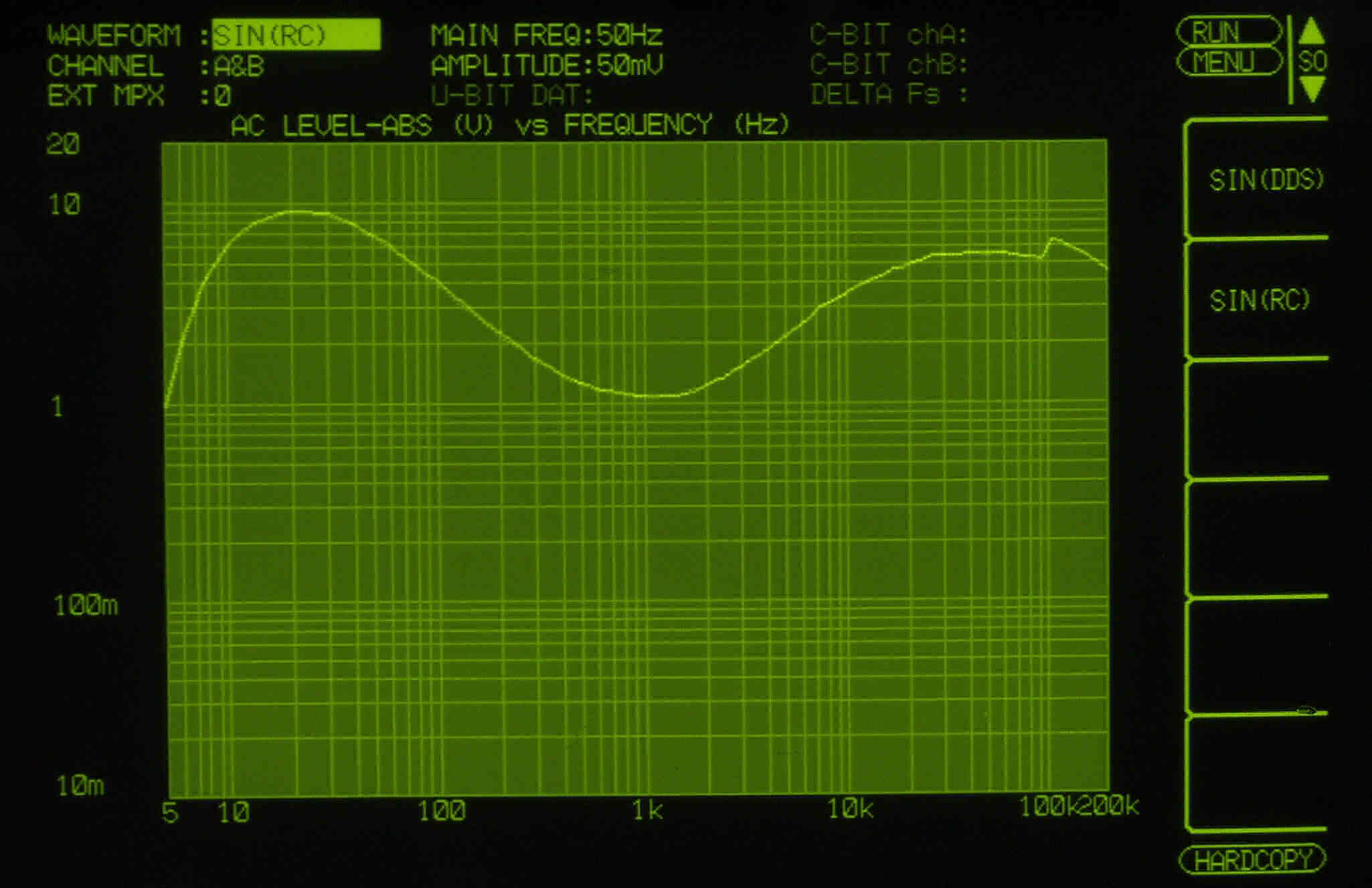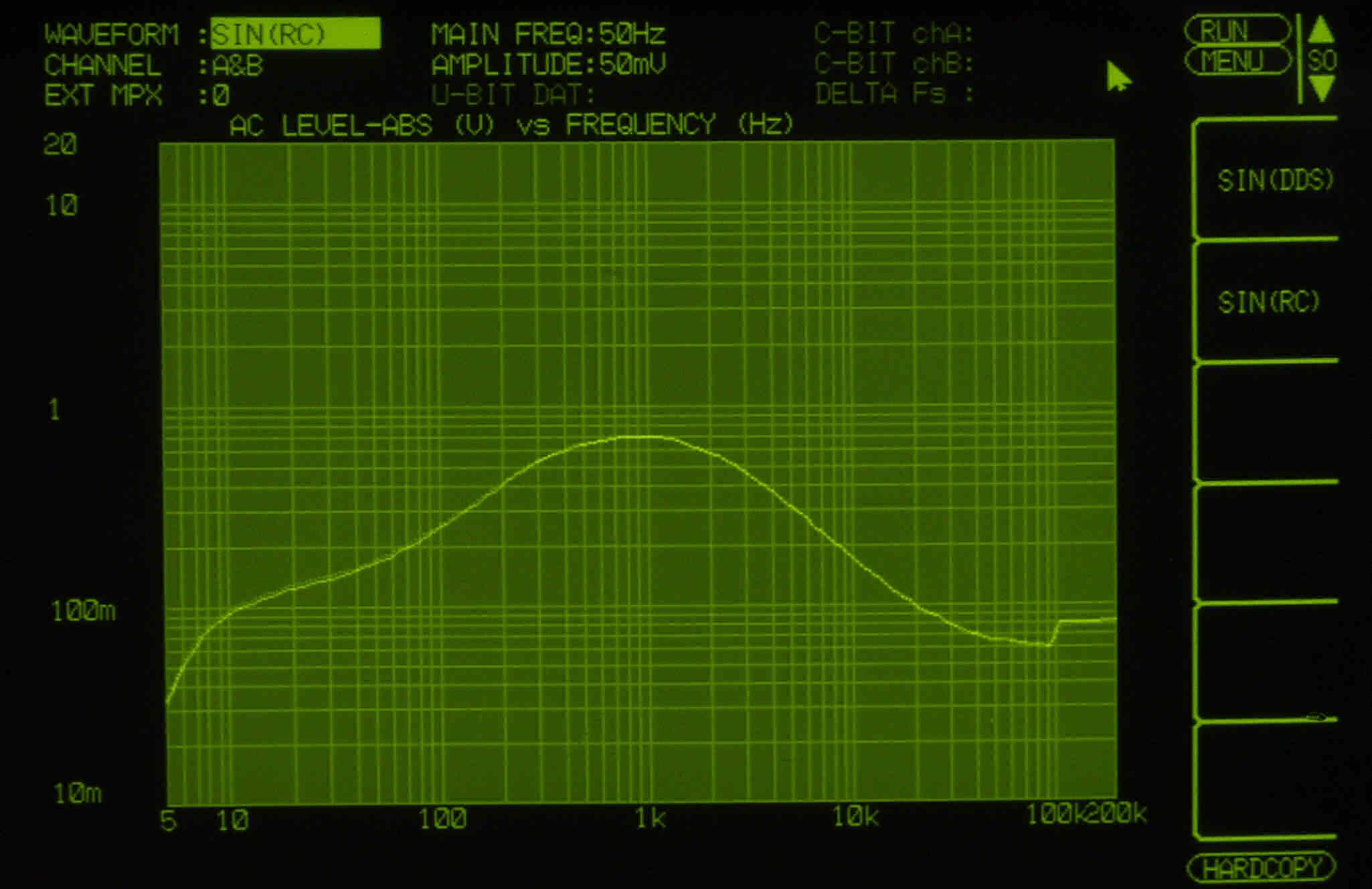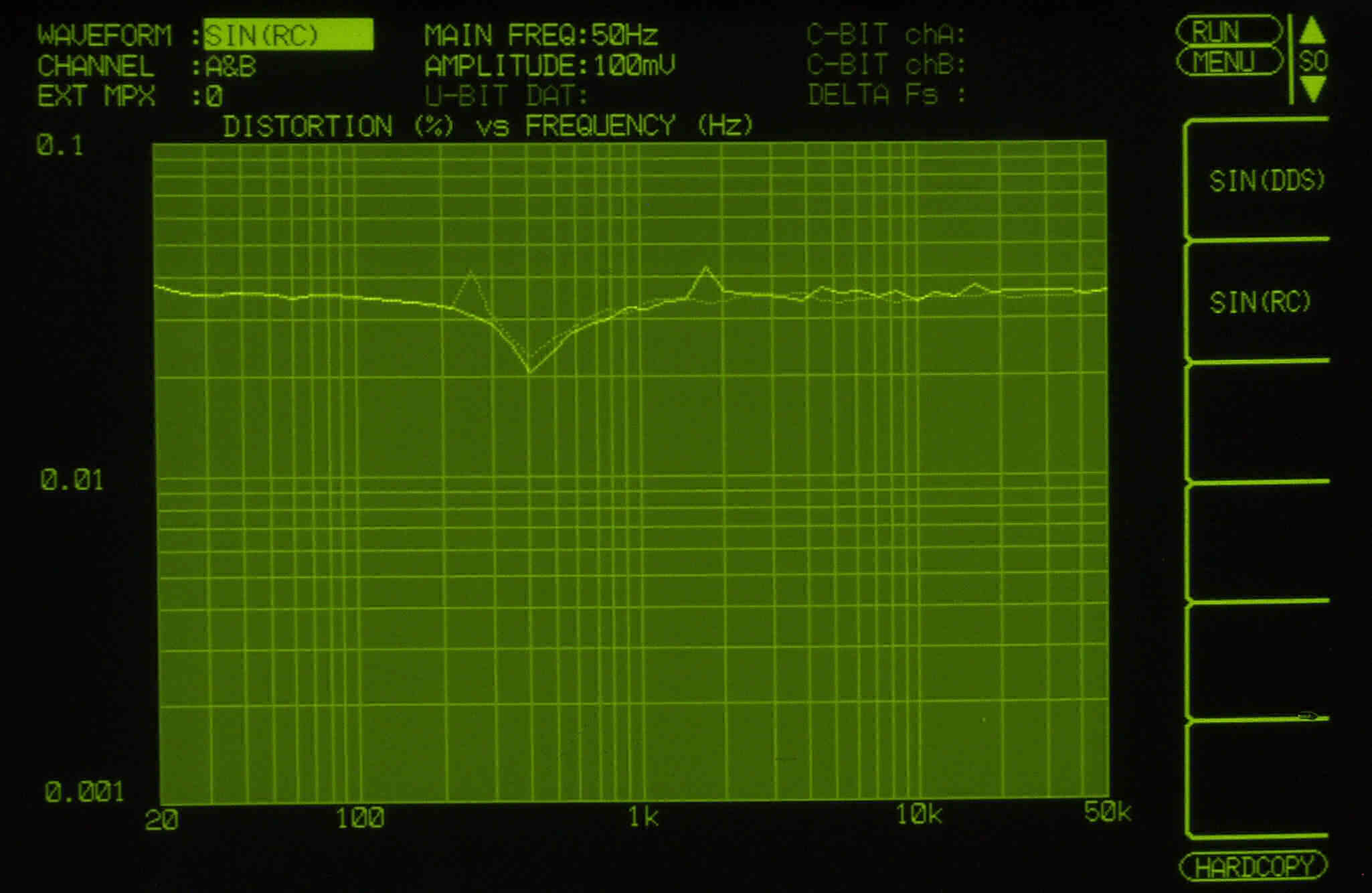 | E41. 出力電圧10V 歪み率=0.9%(測定レンジ=1%) AUX力 1000HZ。 右側は真空管が元気なので、この直ぐ上で飽和する。 | ||||||||||||||||||||||||||||