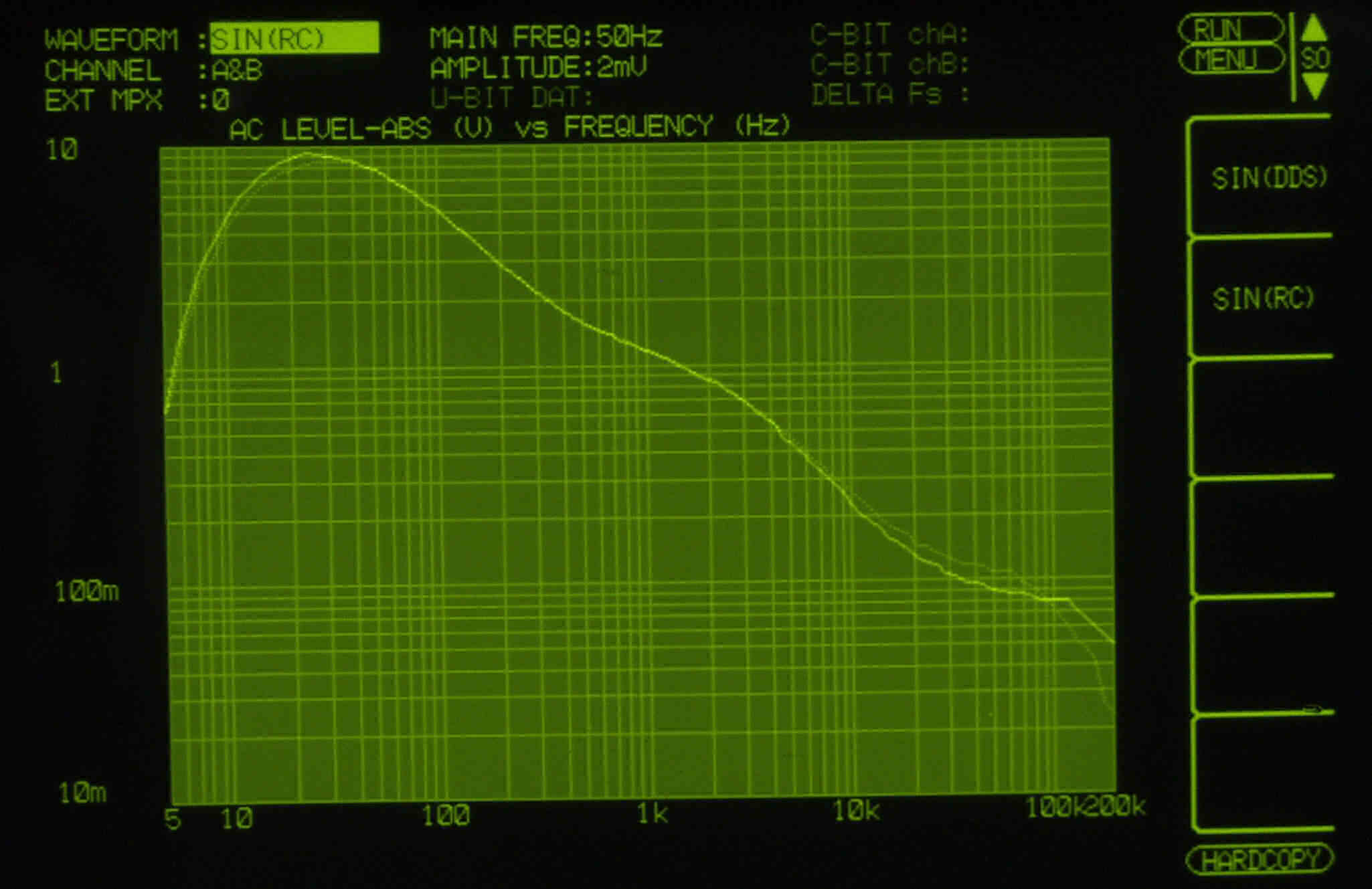 | F15. 入出力特性測定(AUX入力) LowFilter50HZ & HighFilter9KHZ ON。 AUX入力端子へ50mV一定入力 VRはmax 平均で1V出力。 左出力=薄(細い)色 右出力=濃い(太い)色 |