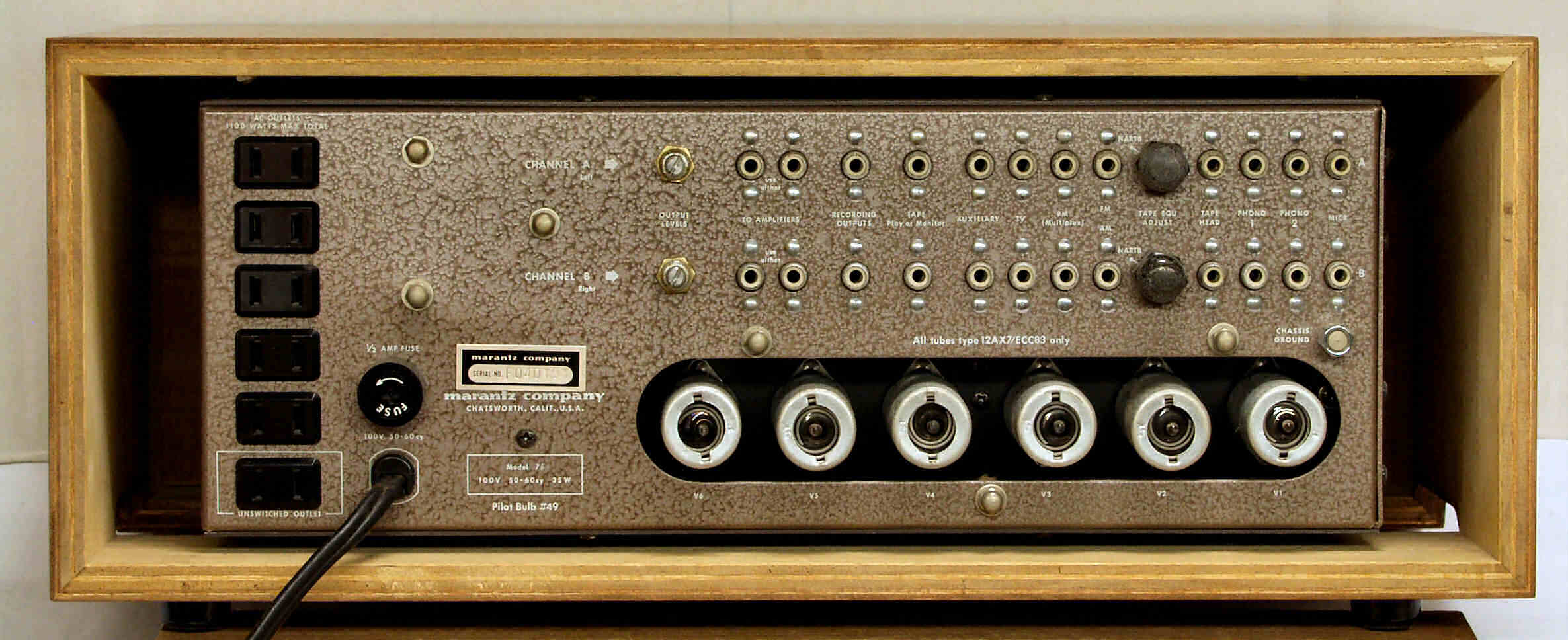 E. 調整・測定 F. 上位測定器による 調整・測定 G. 修理費 40,000円 通常修理、 真空管別途。 3台目からの、お馴染みさん価格。 S. Marantz 7B. の仕様(カタログ・マニアルより) |