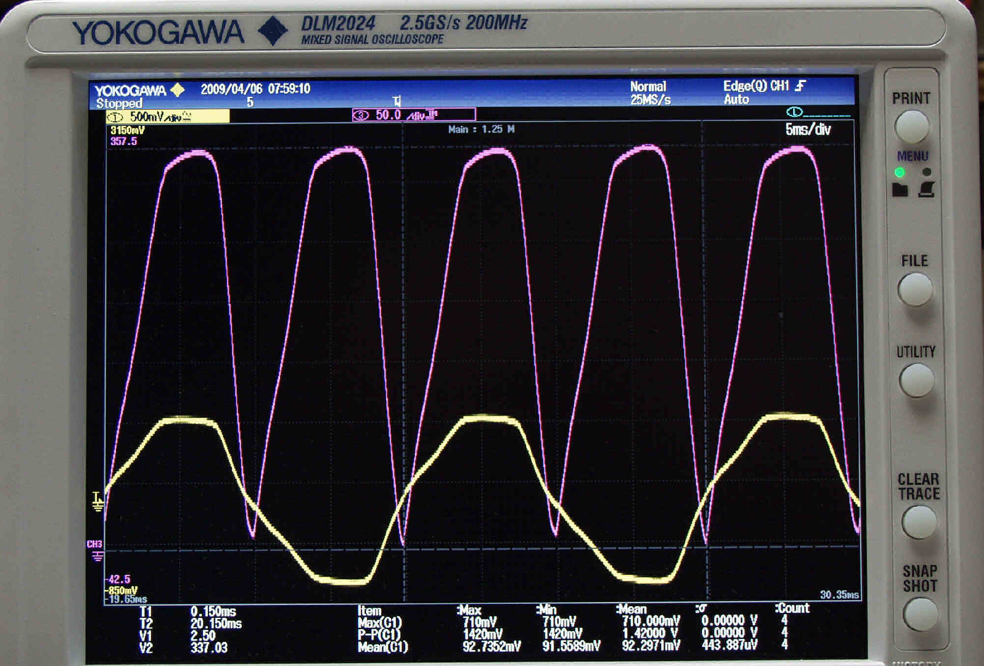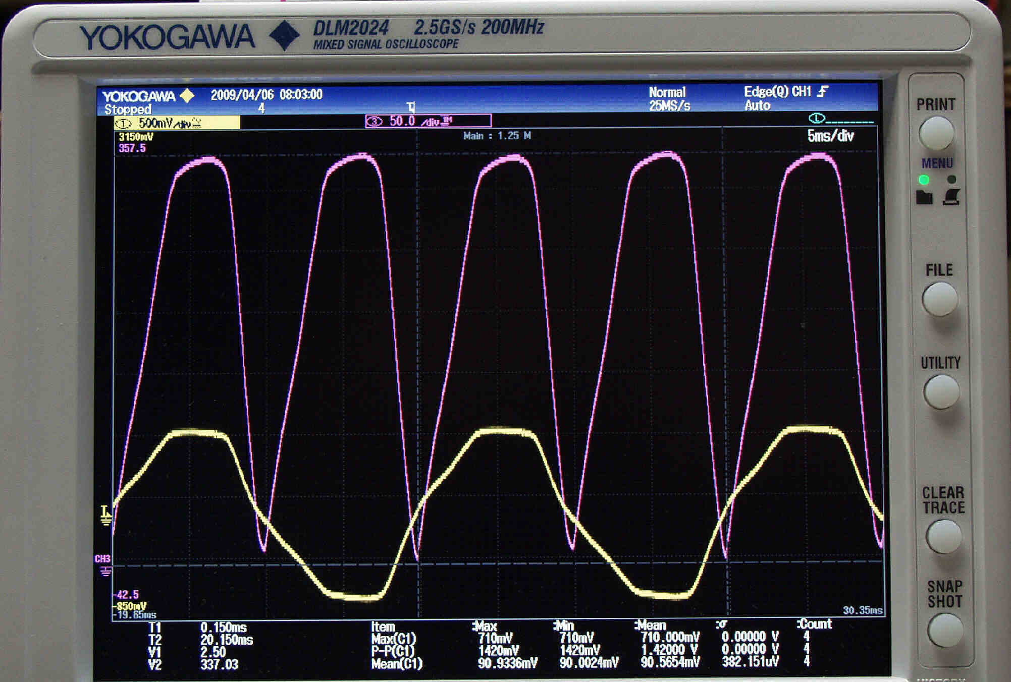 | U43. 付属ECC83「 V4」測定の入出力波形。 赤色=グリッド電圧、黄色=プレート電圧 | ||||||||||||||||||||||||||||