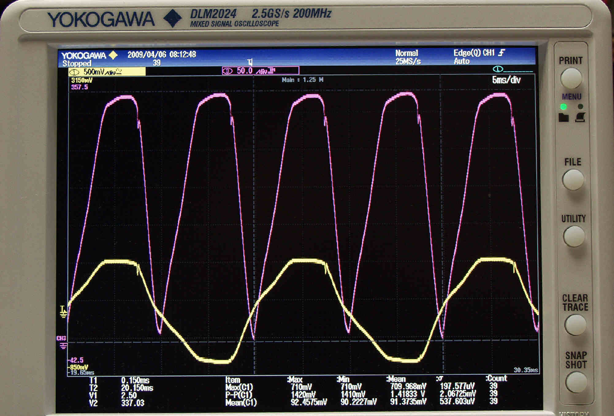 | U33. 付属ECC83「 V3」測定の入出力波形。 赤色=グリッド電圧、黄色=プレート電圧 | ||||||||||||||||||||||||||||