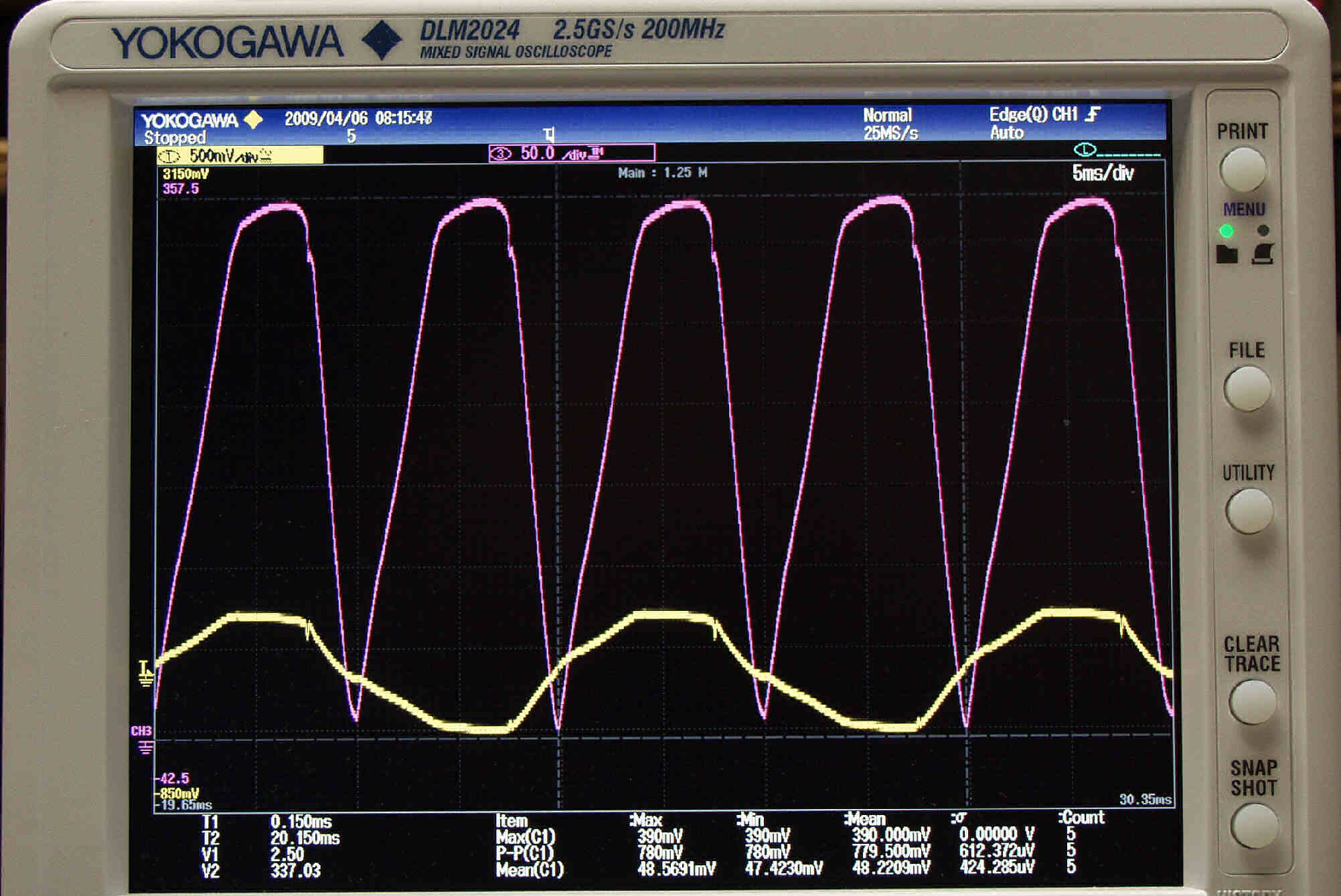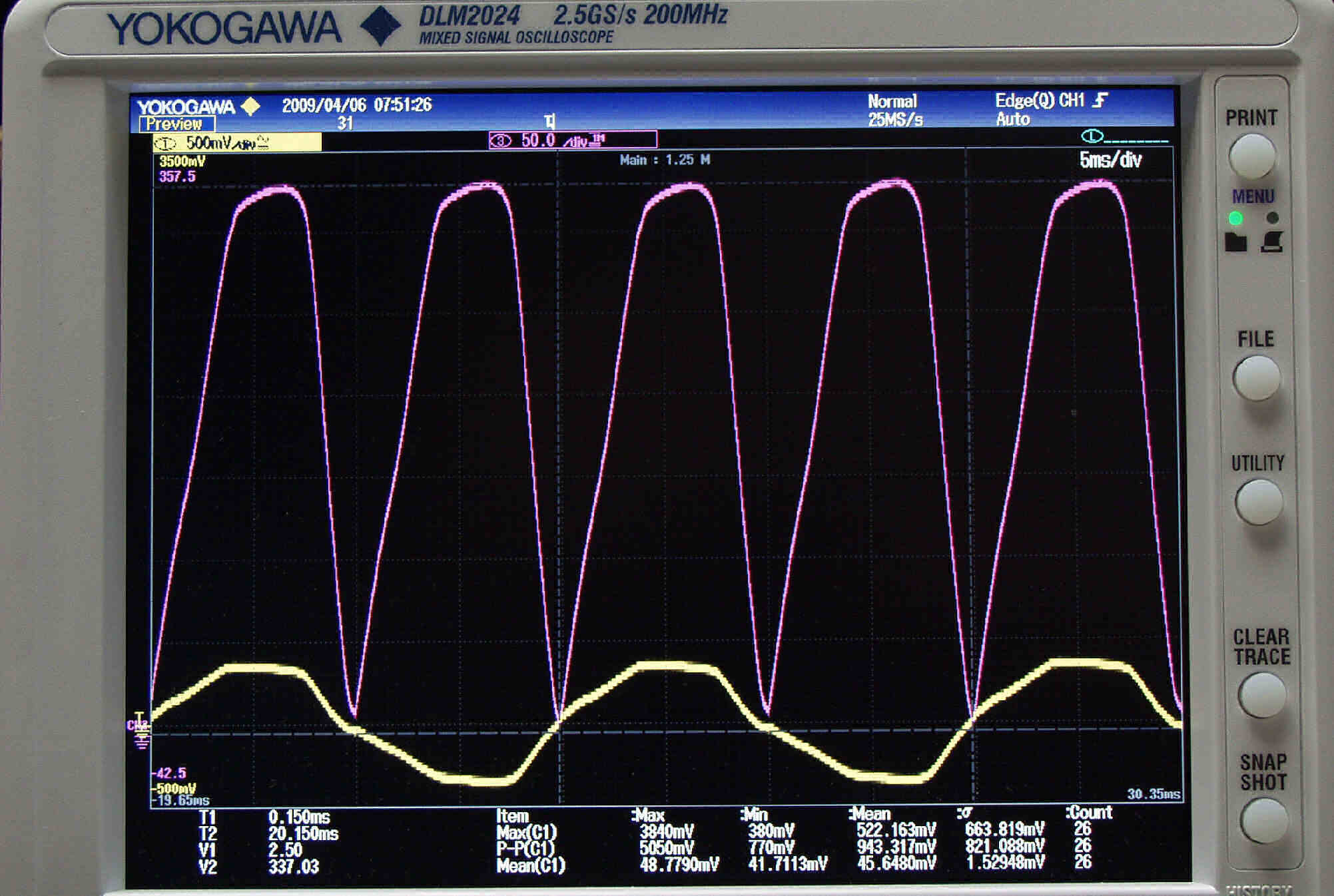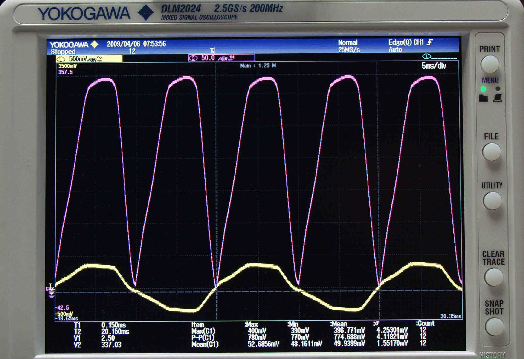 | U53. 付属ECC83「 V5」測定の入出力波形。 赤色=グリッド電圧、黄色=プレート電圧 | ||||||||||||||||||||||||||||
