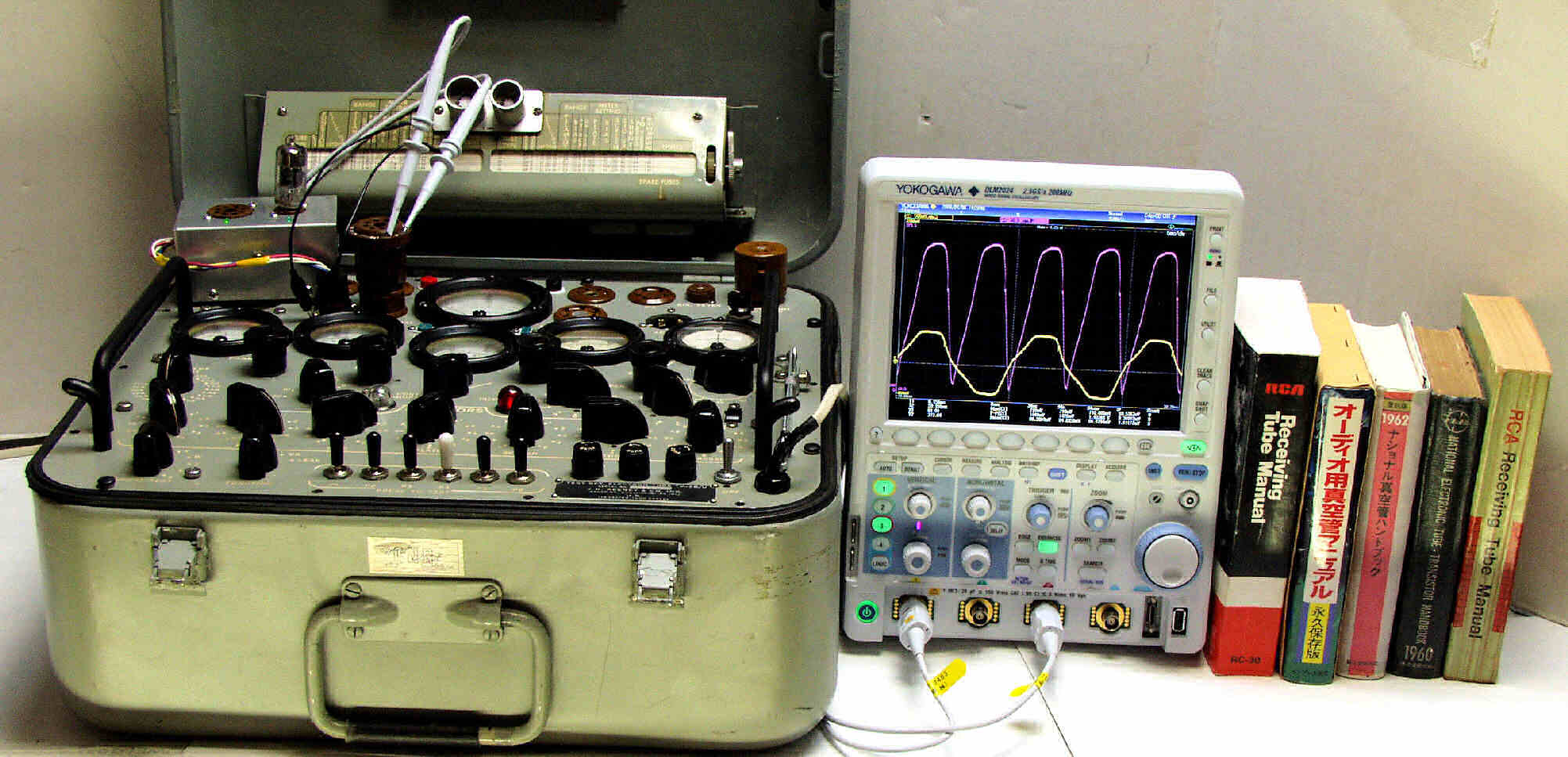 | U. TubeTester Hickok TV−2B/Uによる付属真空管測定 U1. 右のデジタルオシロはデモで拝借、YOKOGAWA DLM2024 |