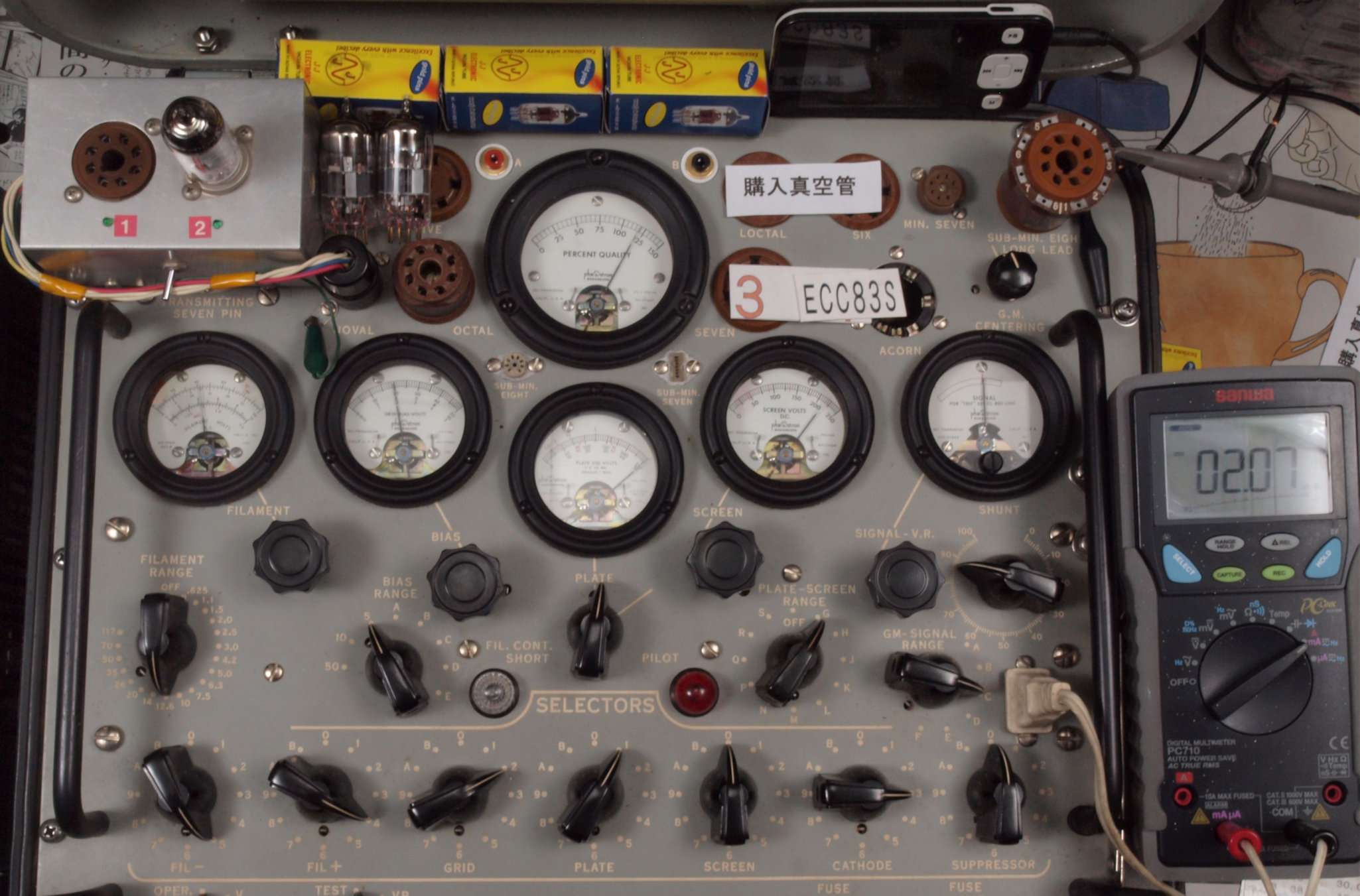 | V61. 購入6本目 ECC83S ユニット1。 Gm測定=2400μmho、IP=2.08mA。 Cレンジ=3000μmhoレンジでの測定、「Ep=250V、Eg1=−2V」 |