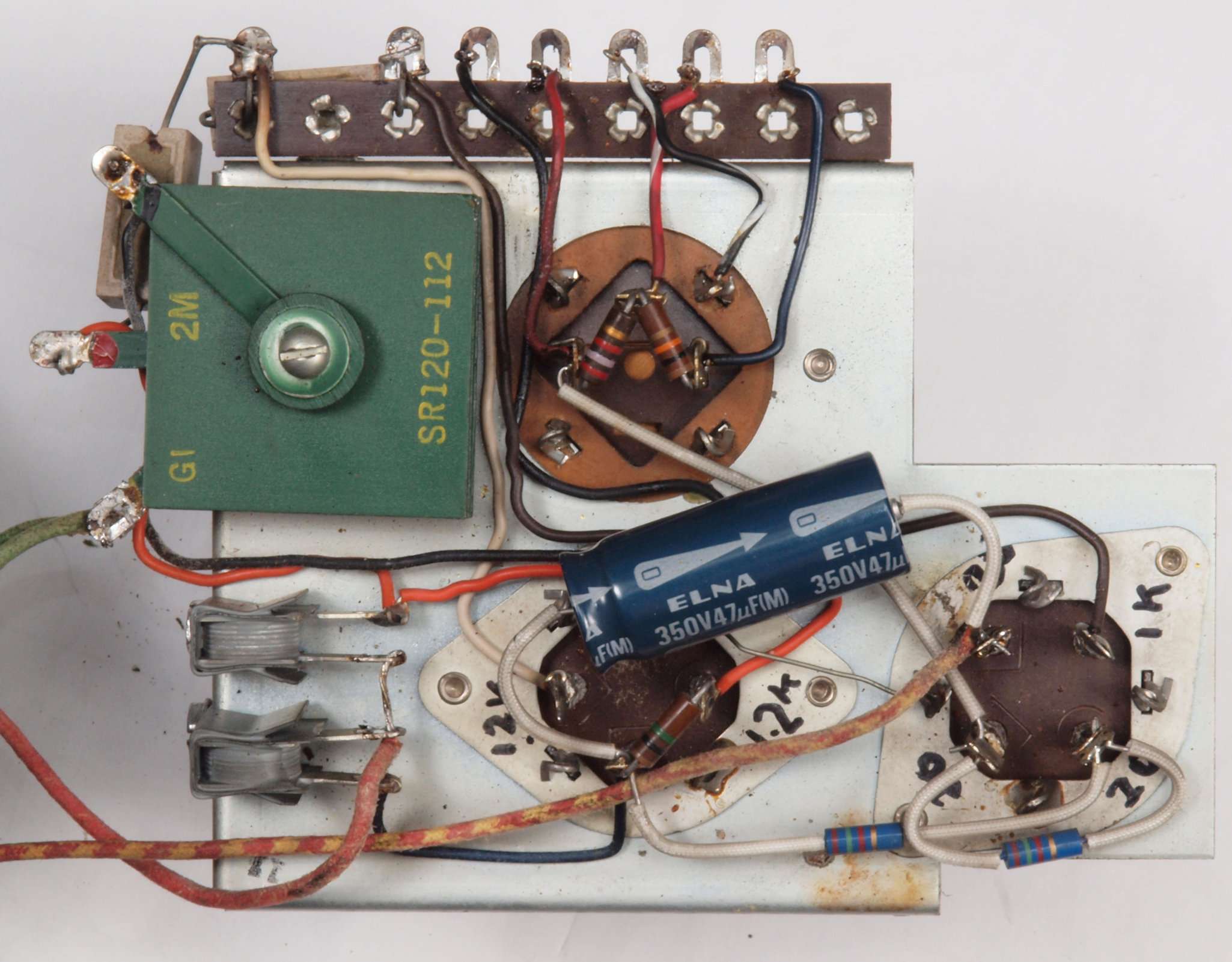 | C54. 修理後 電源部シャーシ裏。 整流器、電解コンデンサー全部交換する。出力遅延回路組み込み。 | ||||||||||||||||||||||||||||||