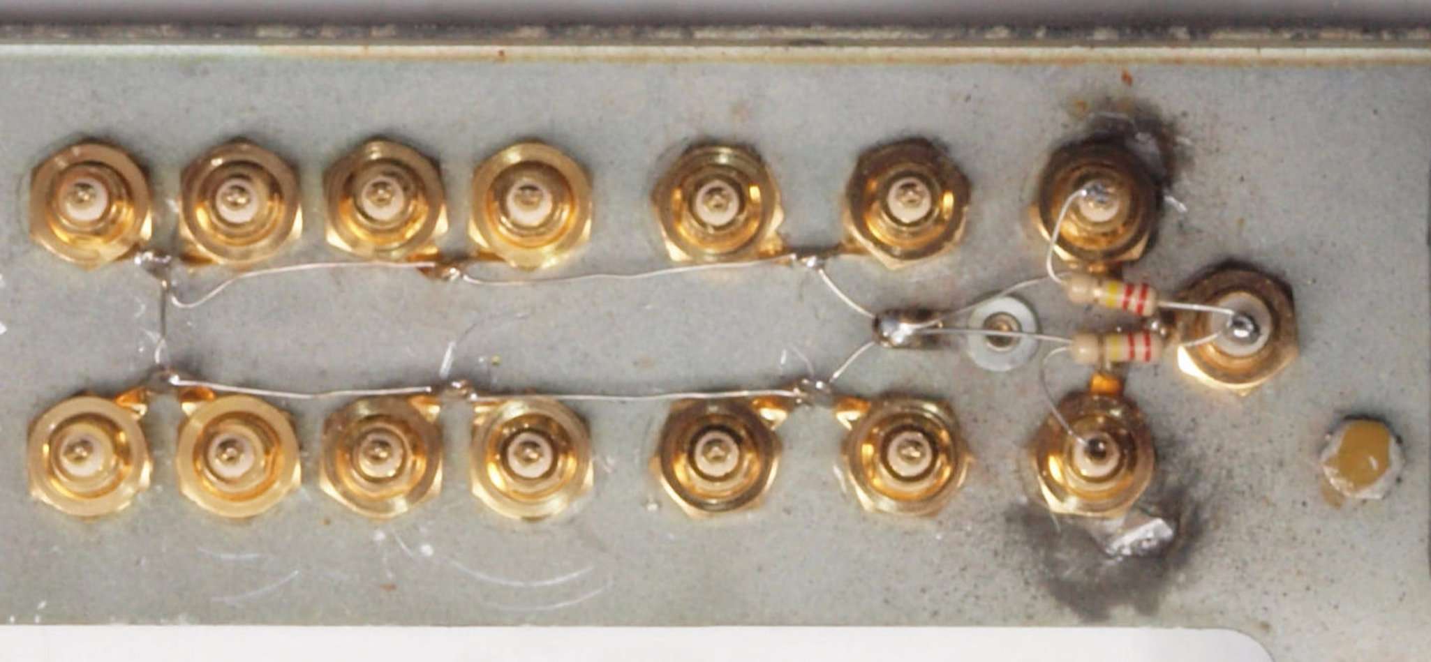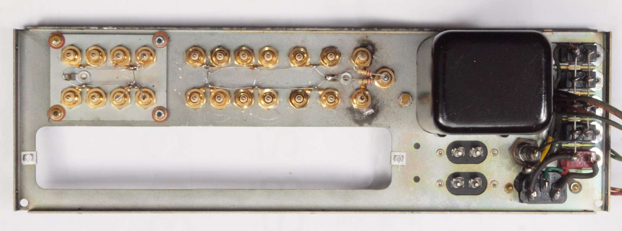 | CF4. 修理後 後パネル裏加工終了。 トランス取り付け、RCA端子とアース線取り付け、負荷抵抗取り付け。 | ||||||||||||||||||||||||||||||