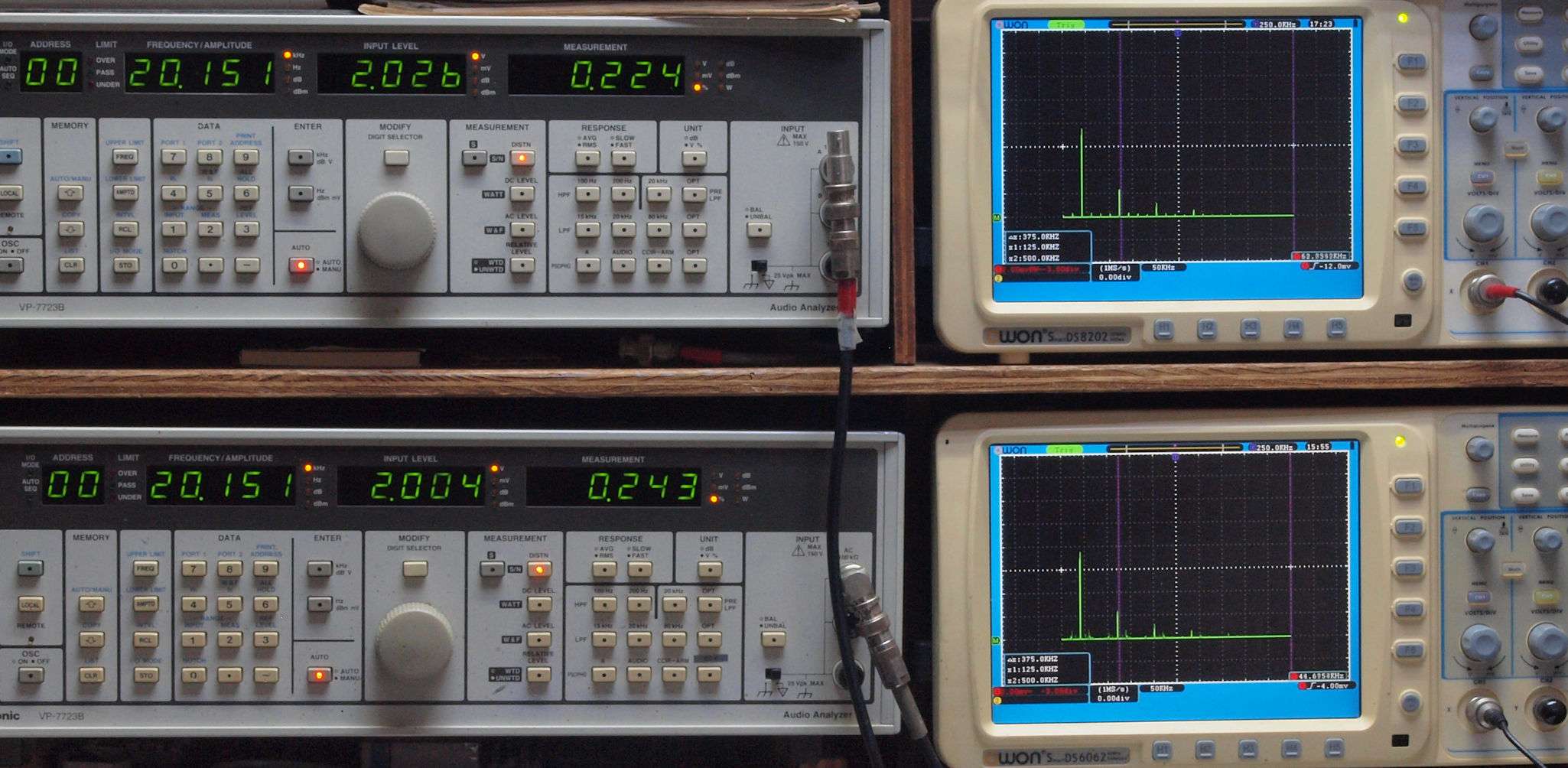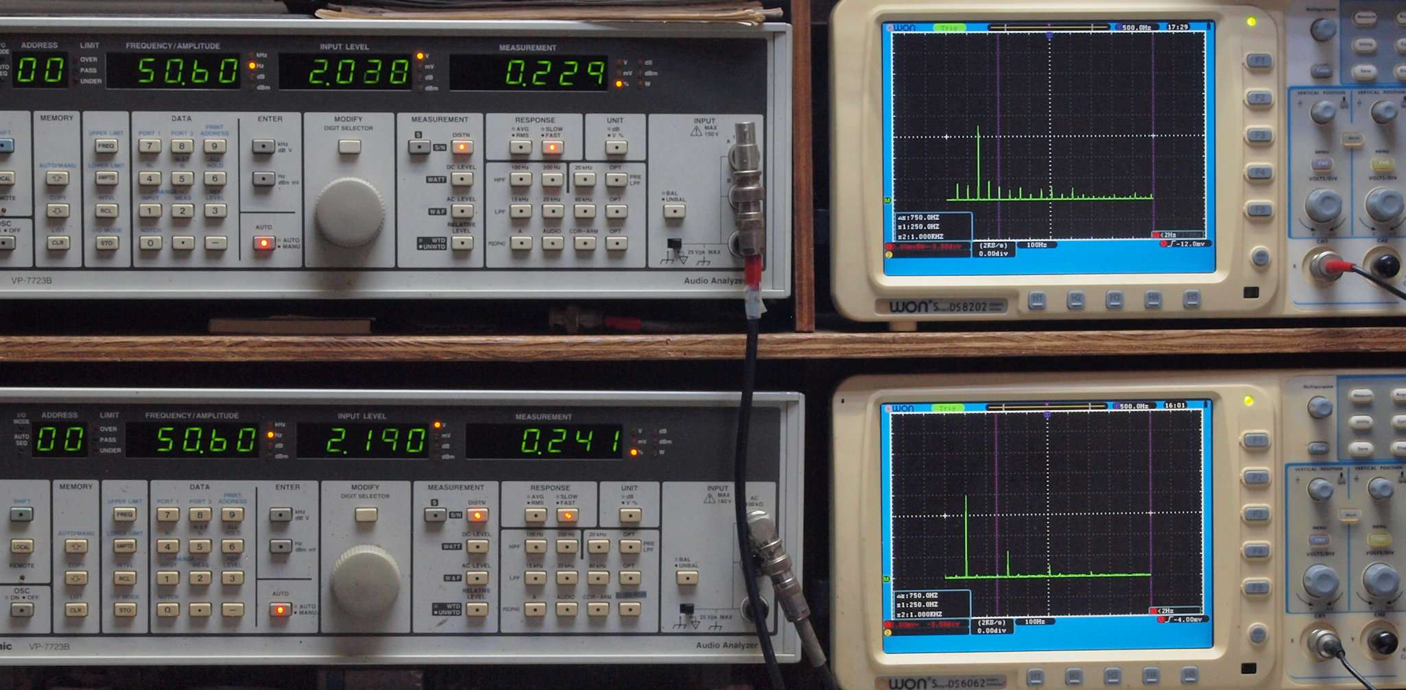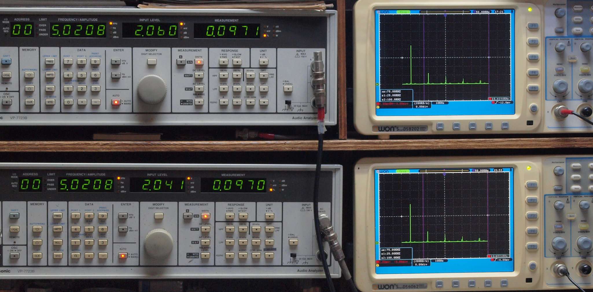 | E. 調整・測定。 画像をクリックすると、大きく(横幅2050ドット)表示されます。 E1. 出力・歪み率測定・調整。 電源電圧100Vにて測定。 「見方」。 上段中 右側出力を「Audio Analyzer Panasonic VP−7723B」により測定。 表示LED、 左端=メモリーNo、 中左=周波数測定、 中右=出力電圧測定、 右端=歪み率測定。 上段右端 VP−7723Bの基本波除去出力を「owon SDS8202(200MHZ)」で「FFT分析」表示。 下段中 左側出力を「Audio Analyzer Panasonic VP−7723B」により測定。 表示LED、 左端=メモリーNo、 中左=周波数測定、 中右=出力電圧測定、 右端=歪み率測定。 下段右端 VP−7723Bの基本波除去出力を「owon SDS6062(200MHZ)」で「FFT分析」表示。 下段左端 オーディオ発振器 VP−7201A より50Hz〜100kHzの信号を出し(歪み率=約0.003%)、ATT+分配器を通し、AMPに入力。 よって、ダイアル設定出力レベルより低くなります。測定機器の仕様や整備の様子はこちら、「VP−7723B」「VP−7201A」。 FFT画面の見方はこちら。 |
