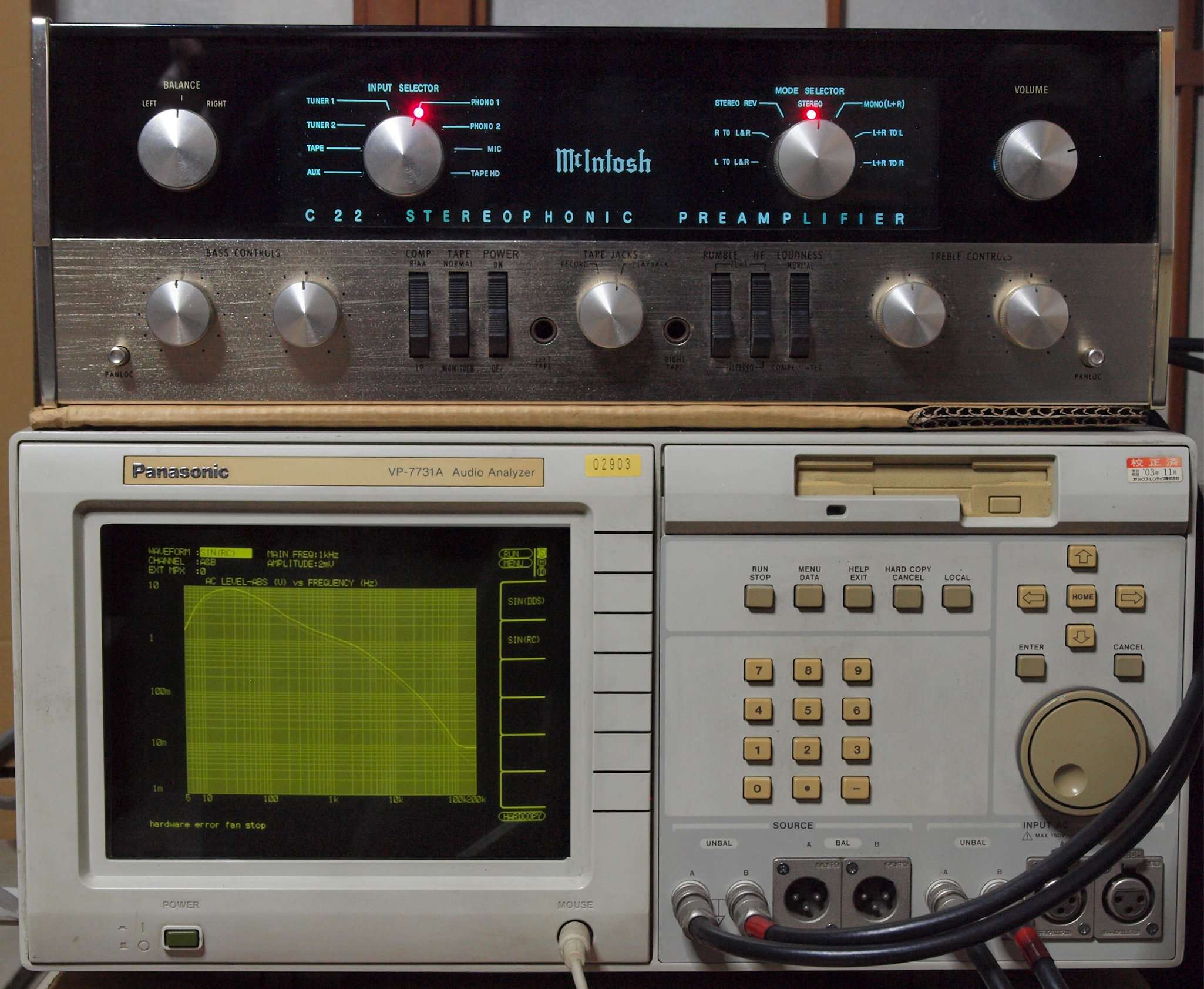 | F. 上位測定器による 調整・測定。 画像をクリックすると、大きく(横幅2050ドット)表示されます。 F0. 下のオーディオアナライザーVP−7732Aで自動測定。 |