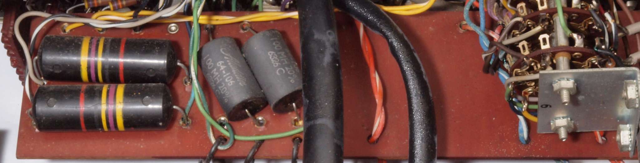 | C64. 修理後 出力RCA端子郡裏。 シールド線に熱收縮チューブを被せる、抵抗2個交換。 | ||||||||||||||||||||||||||||||